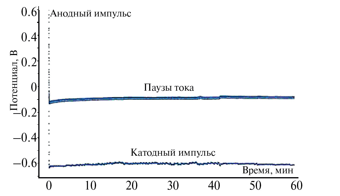 На рис. 4 приведена типичная зависимость изменения потенциала стеклоуглеродного рабочего электрода в ходе гальваноимпульсного электролиза расплава. Во время наложения импульса катодного тока потенциал находится в области значений около –0.6 В, тогда как во время паузы потенциал смещается к значению около –0.08 В относительно кремниевого квазиэлектрода сравнения. Так как величина катодной плотности тока импульса гораздо выше, чем при гальваностатическом электролизе, то и потенциал во время импульса катодного тока имеет более отрицательное значение. При этом стоит отметить его относительно стабильное значение в ходе электролиза.