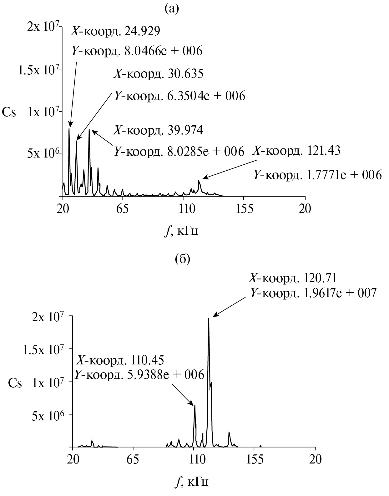 Температура расплава алюминия снижалась и по результатам Фурье-анализа спектров строились графики зависимости мах. Сs от f для температур 800°С (рис. 1а) и 690°С (рис. 1б).