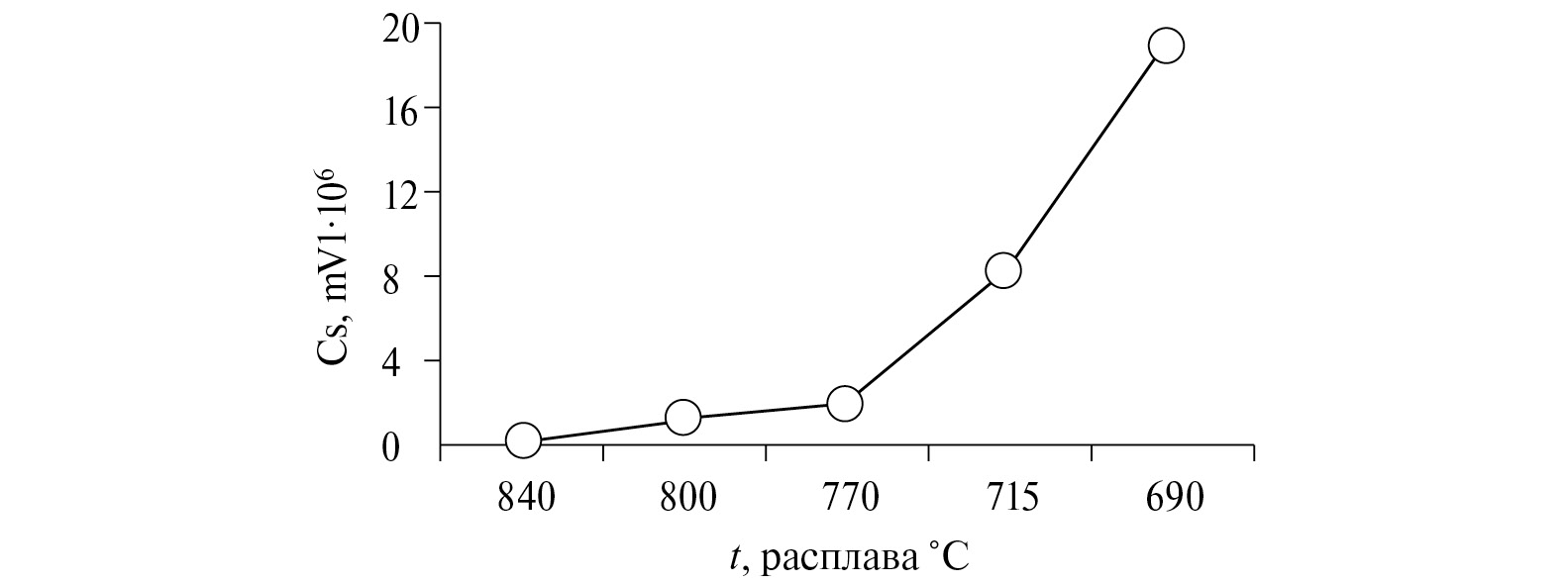 На основании результатов Фурье-анализа (рис.1) видно, что при перегреве расплава на 200°С выше температуры ликвидуса наблюдалась периодичность мах. Сs с частотой следования 7–8 кГц. При уменьшении температуры расплава амплитуда сигналов (индекс Сs) в спектре низких частот уменьшается и при 690°С достигает уровня фона, а мах. Сs для f = 121 кГц увеличивается и достигает при температуре 690°С наибольшей величины (рис. 2).