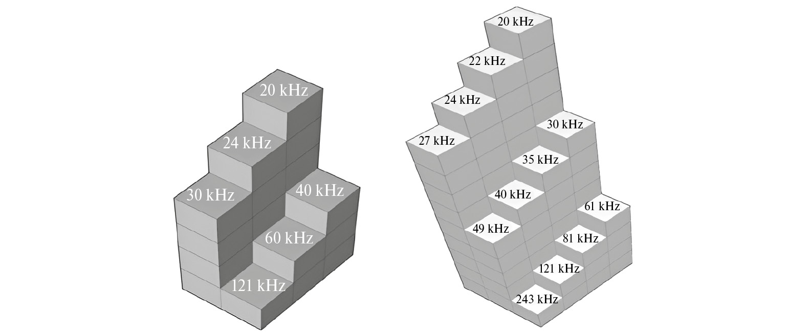 Все частоты спектра условно подразделялись на две группы: низкочастотные для диапазона 20–60 кГц и высокочастотные для диапазона 90–200 кГц.