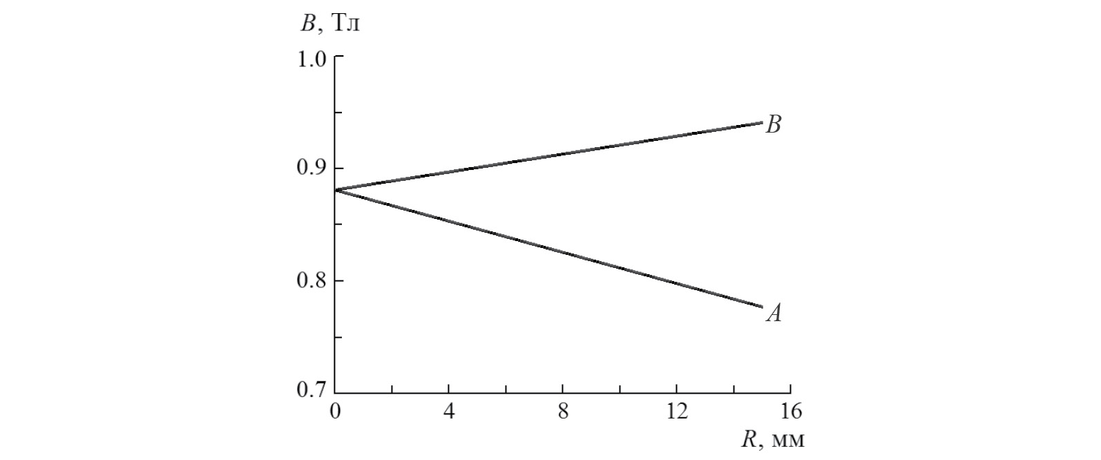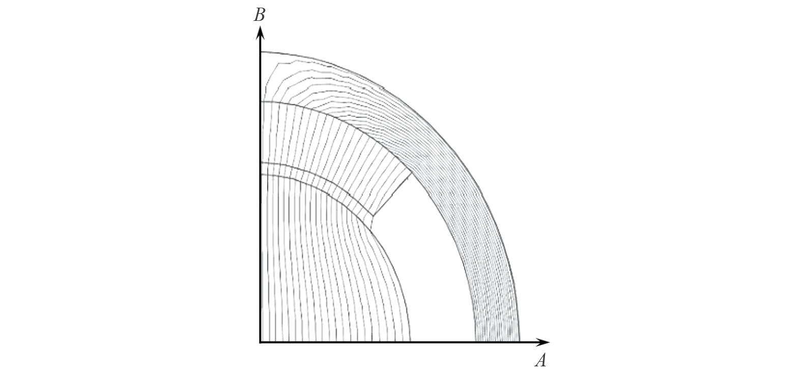 Из соображений симметрии магнитного поля на рисунке приведена лишь четвертая часть магнитной системы. Как и предполагалось, картина магнитного поля (рис. 2) подтверждает, что векторы индукции магнитного поля в разных точках образца имеют радиальное направление и являются коллинеарными между собой.