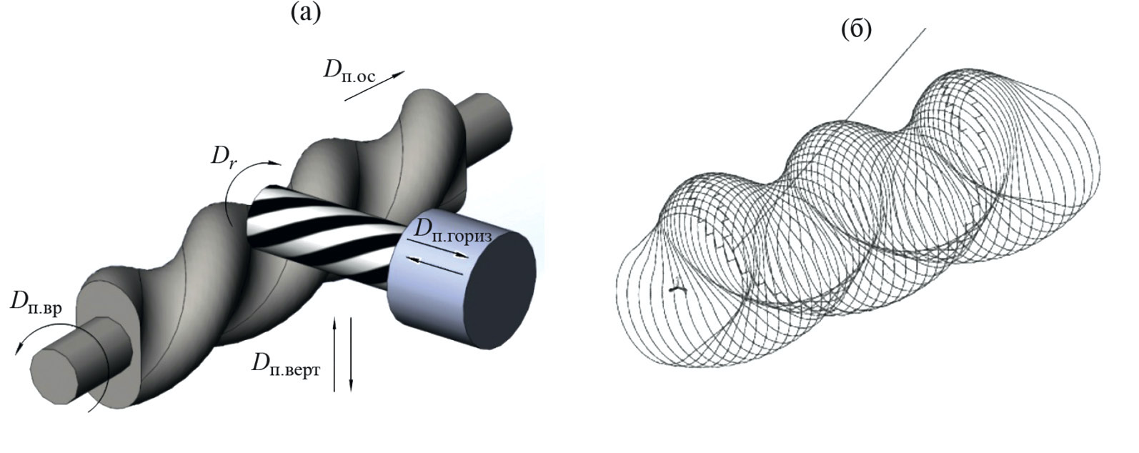 Изучение закономерностей взаимодействия в системе «станок–инструмент–приспособление–заготовка» является важной технологической задачей, раскрывающей потенциальную возможность повышения качества обрабатываемой детали за счет грамотного назначения различных параметров обработки [1–5]. Одной из областей, в которой данные взаимосвязи изучены не в полной мере, является обработка циклоидальных сложнопрофильных винтовых поверхностей. Такие поверхности нашли применение при изготовлении рабочих органов одновинтовых объемных машин (рис. 1). Подобные машины широко используются в различных областях: в пищевой промышленности, в химической отрасли, для транспортировки нефтепродуктов [6, 7]. Основным способом производства винтовых поверхностей является их изготовление с помощью специальных профилированных инструментов путем копирования, однако такой способ не является гибким и имеет ряд ограничений [8–11]. Вместо традиционного способа в настоящей статье предложена специальная стратегия обработки винтовых поверхностей на станках с числовым программным управлением (ЧПУ) непрофилированным инструментом.