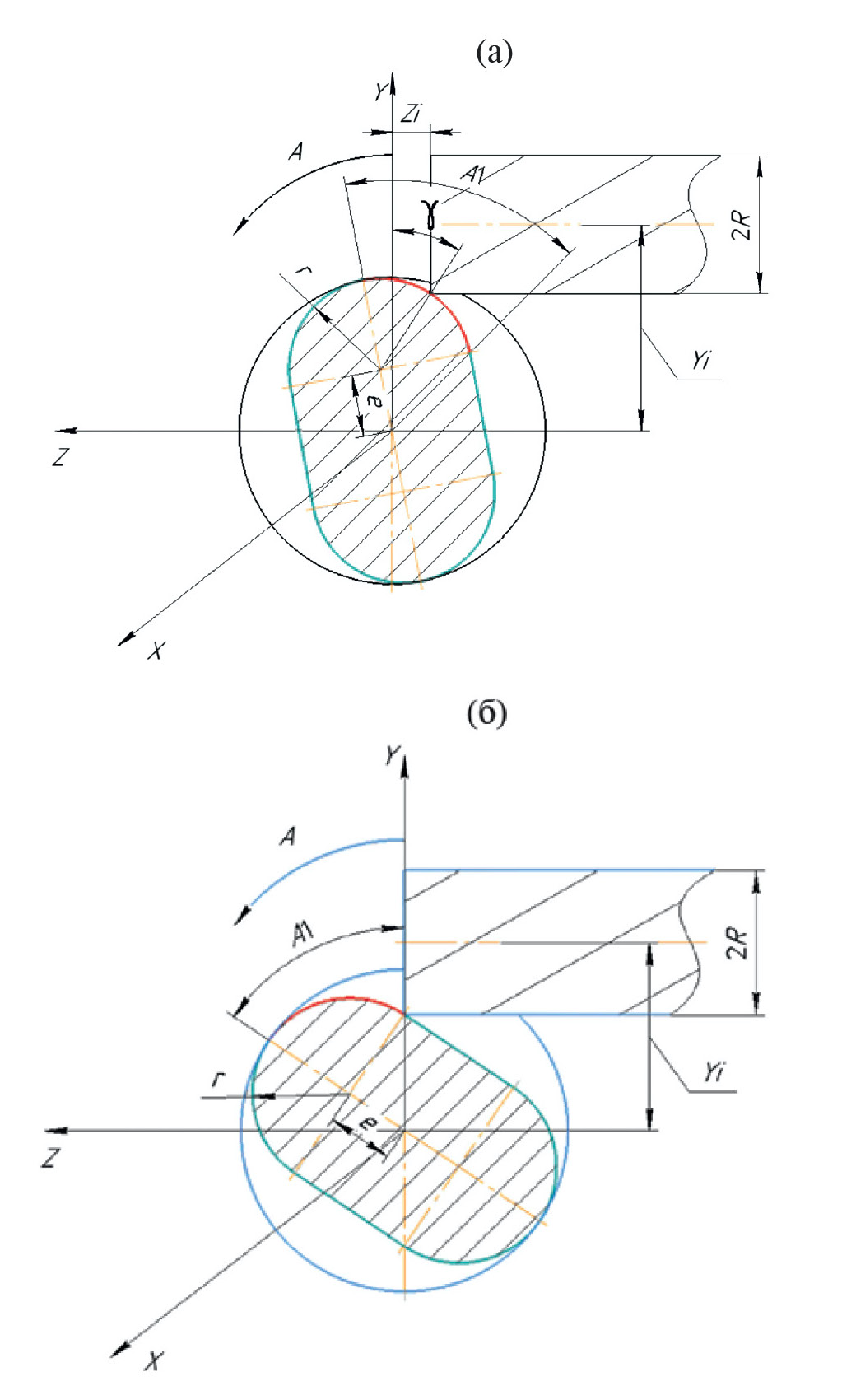 Разработка аналитического выражения ограничительного критерия. Для разработки критерия, накладывающего ограничения на параметры диаметра сечения ротора, его шаг, эксцентриситет, а также диаметр использующейся фрезы при обработке винтовой поверхности на 4-координатном станке с ЧПУ с помощью предложенной специальной стратегии обработки, необходимо изучить математическую модель обработки. Необходимые схемы обработки представлены на рис. 5 и 6.