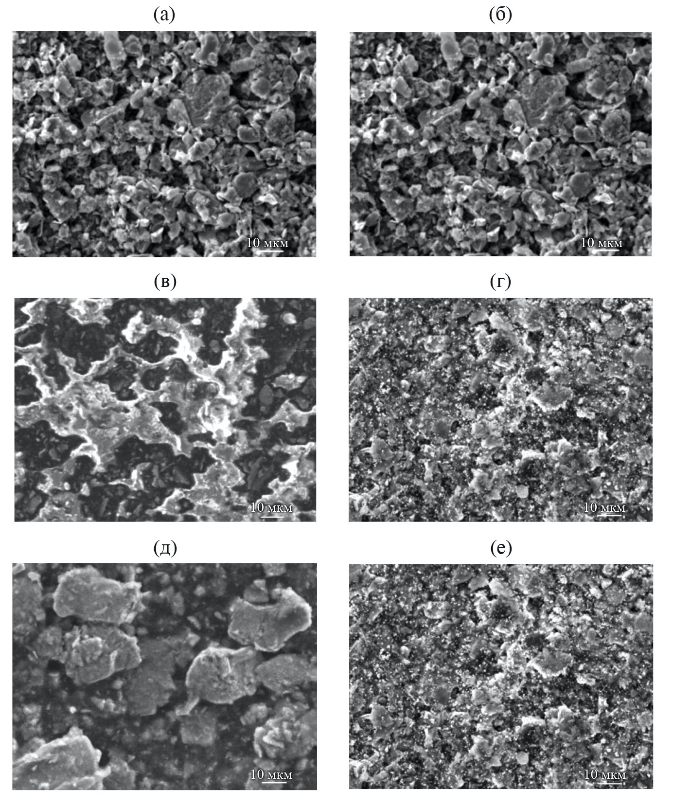 У покрытия образца 4, легированного Sb2O3, отсутствуют заметные поры (рис. 2г). Из литературы известно, что Sb2O3 повышает твердость твердосмазочных покрытий. Для покрытия образца 6 характерно наличие мелкодисперсных равномерно распределенных включений углерода (рис. 2д).