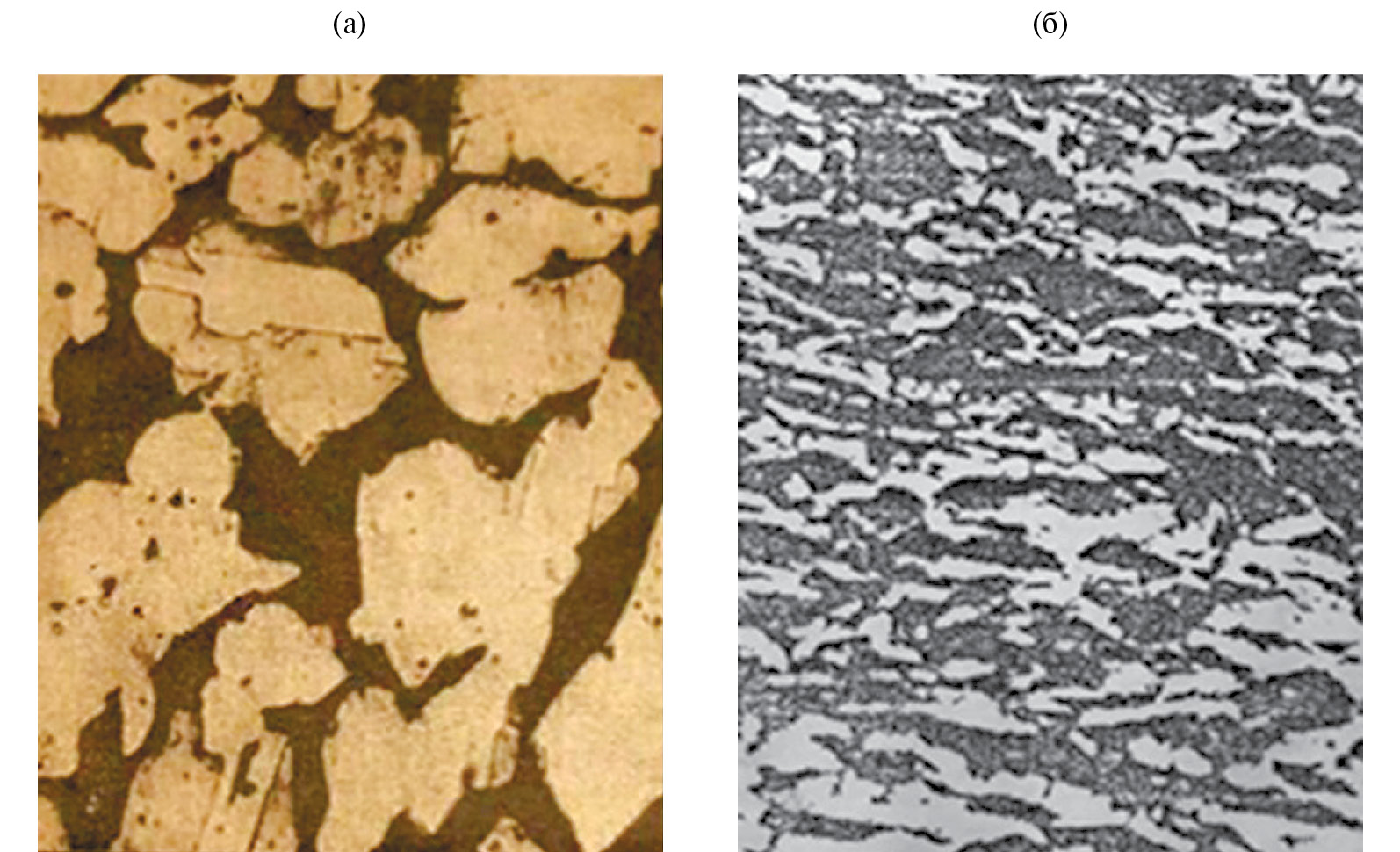 Рис. 2. Микроструктура металлической арматуры (а) и термопластичной массы (б) ×500.