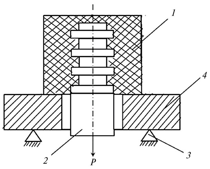 Рис. 5. Испытание пластмассовой детали для прямоугольного резьбового образца: 1 – деталь из термопласта; 2 – металлический арматур; 3 – опора; 4 –приспособления.