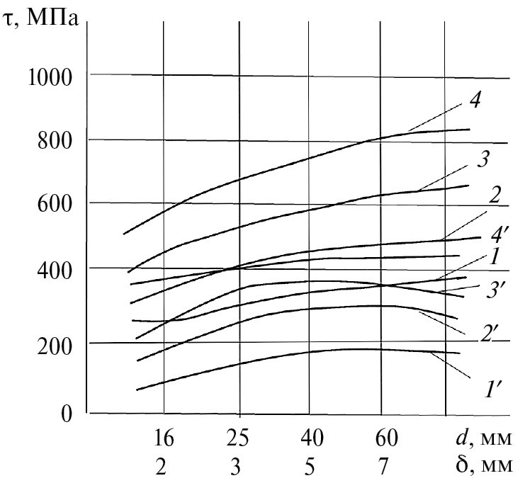 Рис. 8. Зависимость предела прочности на срез резьбы детали из термопласта от диаметра металлической арматуры и защитной толщины: 1 – L = 10 мм; 2 – L = 20 мм; 3 – L = 30 мм; 4 – L = 40 мм; 1, 2, 3, 4 – “металл–термопласт”; 1′, 2′, 3′, 4′ – “металл–металл”.