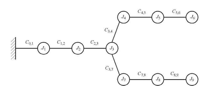 В качестве упрощения можно считать, что трение в системе отсутствует, а все нелинейные элементы системы линеаризованы, колебания масс происходят с малыми амплитудами [19, 20]. Численные значения моментов инерции Ji элементов крутильно-колеблющейся системы представлены в табл. 1. Численные значения жесткости Ci, i+1 крутильно-колеблющейся системы представлены в табл. 2.