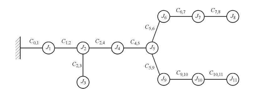 Вторая схема состоит из одиннадцати масс (рис. 2): J1 — момент инерции двигателя, кг·м2; J2 — момент инерции водила планетарного редуктора (ПР), сателлита и вала в сборе, кг·м2; J3 — момент инерции солнечной шестерни планетарного редуктора, кг·м2; J4 — момент инерции коробки передач (КПП), кг·м2; J5 — момент инерции главной передачи и дифференциала, кг·м2; J6 и J9 — моменты инерции бортовых редукторов (БР) и дисков, кг·м2; J7 и J10 — моменты инерции шин, кг·м2; J8 и J11 — моменты инерции поступательных масс (ПМ), кг·м2; C0,1 — жесткость условного участка между креплением двигателя, Н‧м/рад; C1,2 — жесткость демпфера муфты сцепления, Н‧м/рад; C2,3 — жесткость зубчатого зацепление сателлитов с валом водила ПР, Н‧м/рад; C2,4 — жесткость зубчатого зацепления солнечной шестерни ПР с приводом масляного насоса, Н‧м/рад; C4,5 — жесткость участка между ПР и КПП, Н‧м/рад; C5,6 и C5,9 — жесткости участков между главной передачей с дифференциалом и бортовыми редукторами с дисками (правым и левым соответственно), Н‧м/рад; C6,7 и C9,10 — жесткости участков между бортовыми редукторами с дисками и шинами (правым и левым соответственно), Н‧м/рад; C7,8 и C10,11 — жесткости участков между шинами и ПМ, Н‧м/рад.