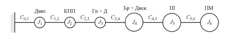 На рис. 1: J1 — момент инерции двигателя, кг·м2; J2 — момент инерции коробки передач (КПП), кг·м2; J3 — момент инерции главной передачи и дифференциала, кг·м2; J4 и J5 — моменты инерции бортовых редукторов (БР) и дисков, кг·м2; J5 и J8 — моменты инерции шин, кг·м2; J6 и J9 — моменты инерции поступательных масс (ПМ), кг·м2; C0,1 — жесткость условного участка между креплением двигателя, Н‧м/рад; C1,2 — жесткость участка между двигателем и КПП, Н‧м/рад; C2,3 — жесткость участка между КПП и главной передачей с дифференциалом, Н‧м/рад; C3,4 и C3,7 — жесткости участков между главной передачей с дифференциалом и бортовыми редукторами с дисками (правым и левым соответственно), Н‧м/рад; C4,5 и C7,8 — жесткости участков между бортовыми редукторами с дисками и шинами (правым и левым соответственно), Н‧м/рад; C5,6 и C8,9 — жесткости участков между шинами и ПМ, Н‧м/рад.