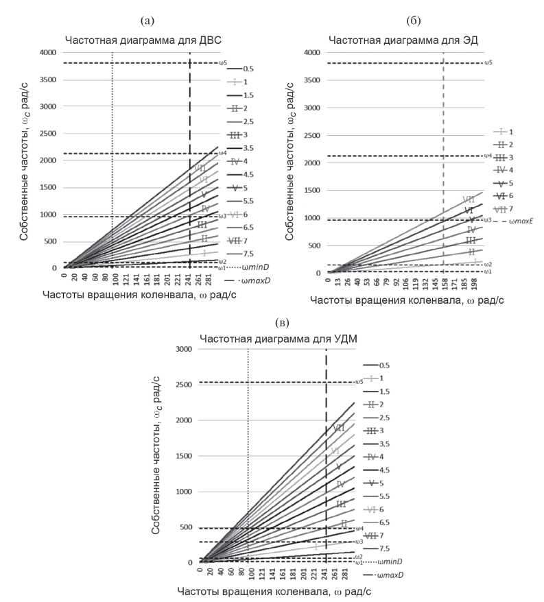 Рис. 4. Частотная диаграмма для: (а) — для 6-массовой схемы с ДВС; (б) — для 6-и массовой схемы с ЭД; (в) — для 6-массовой схемы с УДМ.