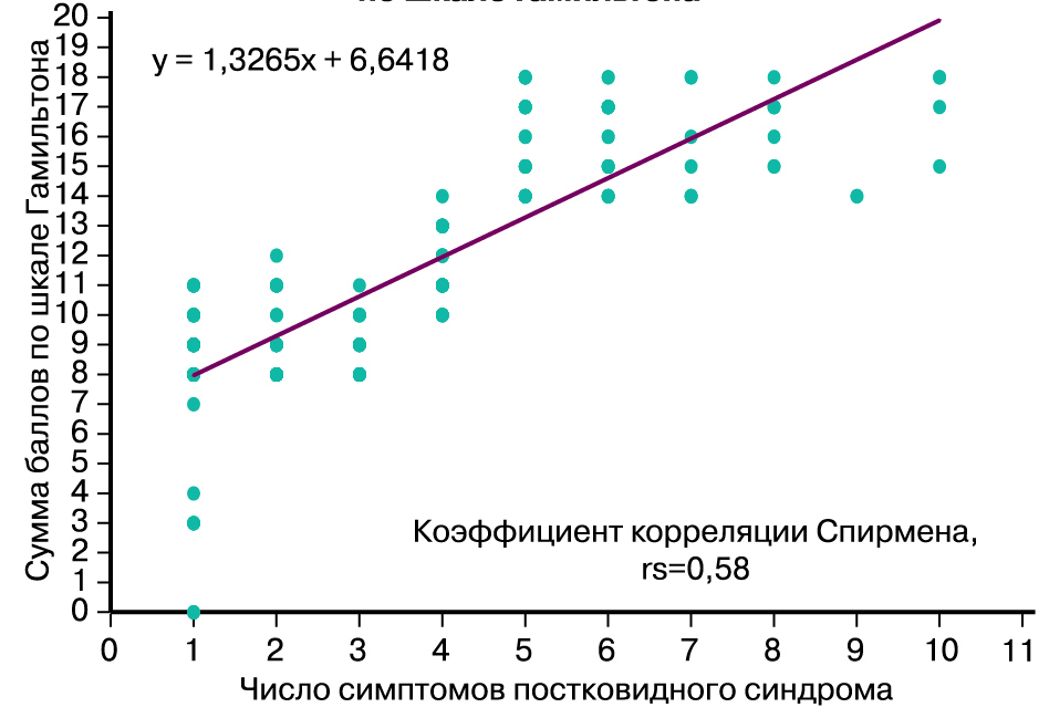Рис. 2. Корреляционный анализ числа симптомов постковидного синдрома и суммы баллов по шкале Гамильтона