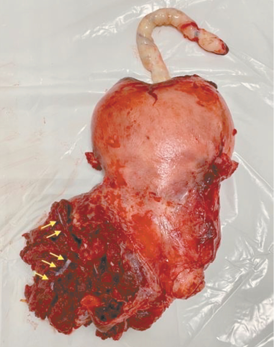Рис. 3. Макропрепарат плаценты при врастании в параметрий (стрелками указаны мощные сосудистые структуры)