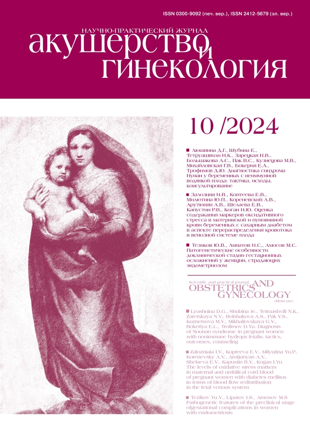 Результаты: Акушерская патология у беременных с эндометриозом различной локализации реализовалась в 100% наблюдений и чаще всего была представлена ранними репродуктивными потерями (15,6%), угрозой прерывания беременности (46,2%), ЗРП (65,2%) и/или хронической гипоксией плода (45,9%), ПР (25,9%), преэклампсией (13,3%). Патологические сдвиги исследуемых маркеров позволили с I триместра гестации у пациенток с эндометриозом различной локализации выделить патогенетические особенности акушерской патологии, имеющей преконцепционное начало: «провоспалительное состояние» и «функциональная недостаточность эндометрия» (ФНЭ). Во II триместре у женщин с аденомиозом и ЭЯ диагностированы дестабилизация сосудистой интимы, активация тромбоцитарного звена, что определено как «эндотелиально-гемостазиологическая дисфункция» (ЭГД). Для доклинической стадии ПР у беременных с эндометриозом характерны нарастание провоспалительного состояния и ФНЭ с последующим присоединением ЭГД; в то время как для ЗРП было характерно умеренное нарастание ЭГД со снижением маркера ангиогенеза PIGF с I триместра.