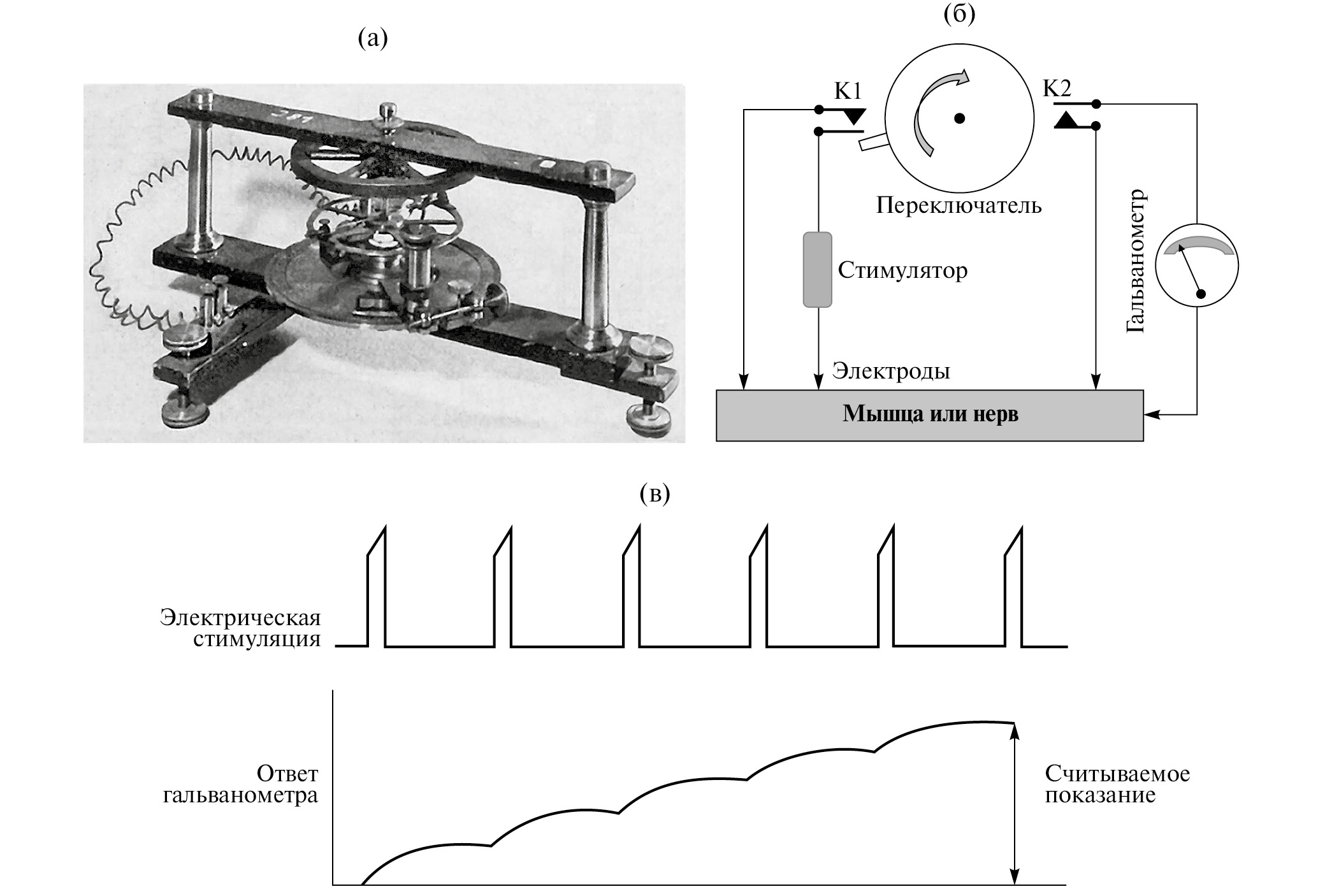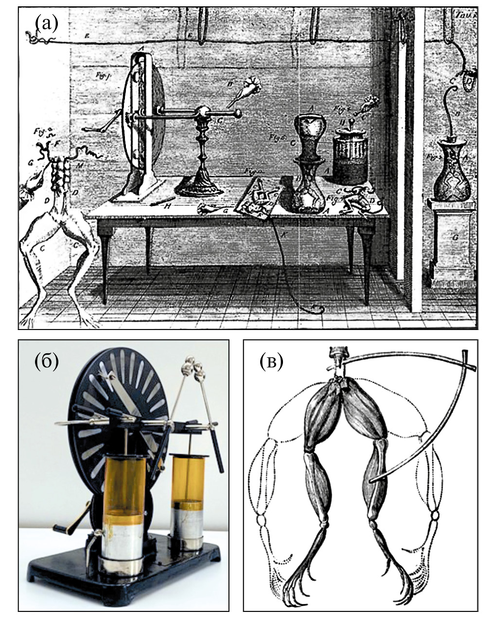 Революционный вклад в развитие представлений о биоэлектричестве внес Луиджи Гальвани (1737–1798), итальянский врач, физиолог и физик, значительная часть научной деятельности которого была посвящена проверке идеи о роли электричества в мышечном сокращении [99]. В своих знаменитых Commentarius [36], опубликованных в 1791 г. и обобщавших эксперименты за период 1780–1790 гг., Гальвани, в частности, констатировал, что препарировал лягушку специально для “электрических исследований”. Его нервно-мышечный препарат включал нижние конечности лягушки с оголенным бедренным нервом и металлический электрод в позвоночном канале. Используя электроcтатический генератор и Лейденскую банку как накопитель и источник электрического заряда (рис. 2а, б), Гальвани удалось продемонстрировать мышечное сокращение в ответ на стимуляцию нерва электрическим разрядом.
