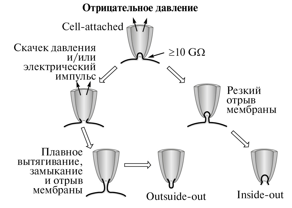 При микронном кончике пипетки неспецифическая утечка была достаточно мала, что снижало шум, а мембрана пэтча содержала всего несколько никотиновых рецепторов, и поэтому ACh, имеющийся в пипетке, инициировал достаточно разрешимые дискретные скачкообразные флуктуации мембранного тока примерно одной амплитуды. Далее, эта методология, которая получила название patch clamp, была улучшена за счет ферментативной обработки клеточной мембраны и использования всасывающего давления, что позволило получать гигаомные сопротивления утечки в контакте пипетка / мембрана [44, 95]. Это позволило воспроизвести классические варианты электрофизиологических регистраций и даже получить новые возможности (рис. 7) [105].