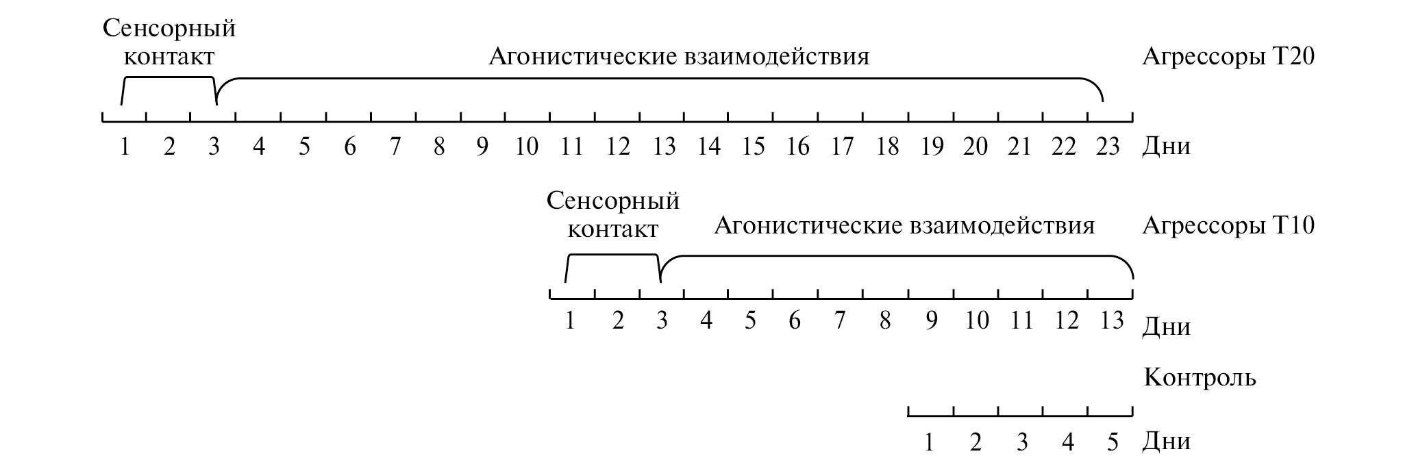 Тестирование поведения начинается через 2–3 дня после адаптации животных к новым условиям содержания и сенсорного знакомства друг с другом. Затем на время тестирования во второй половине дня (13:00–15:00 чаc) крышку клетки заменяют на прозрачное оргстекло, необходимое для наблюдения за животными, и через 5 мин (период активации и привыкания к новому режиму освещения) перегородку убирают на 10 мин, что приводит к агонистическому взаимодействию между самцами. Проявленный в первых тестах (в течение первых 3х дней) опыт побед или поражений при агрессивных столкновениях с одним и тем же партнером закрепляют в последующем при повторных столкновениях (тестах) с партнером противоположного типа поведения. Для этого после теста побежденного самца помещают в незнакомую клетку на чужую подстилку с другим агрессивным самцом за перегородкой. Самцы, побеждающие в межсамцовых конфронтациях, всегда остаются в своем отсеке. Как правило, перегородку возвращают на место, если интенсивные атаки со стороны агрессивного самца длятся более 3х мин, в некоторых случаях меньше, чтобы не допустить физического повреждения терпящего поражение самца. В результате этих манипуляций формируется группа мышей с агрессивным типом поведения – последовательным опытом побед в агонистических взаимодействиях (агрессоры, победители), которые в ежедневных тестах демонстрируют выраженную агрессивность, нападая на незнакомого партнера, преследуя и атакуя его. При этом также формируется группа самцов с субмиссивным (подчиненным, подавленным, угнетенным) типом поведения, демонстрирующих позы подчинения или бегство (жертвы, побежденные) в результате приобретения последовательного опыта социальных поражений.