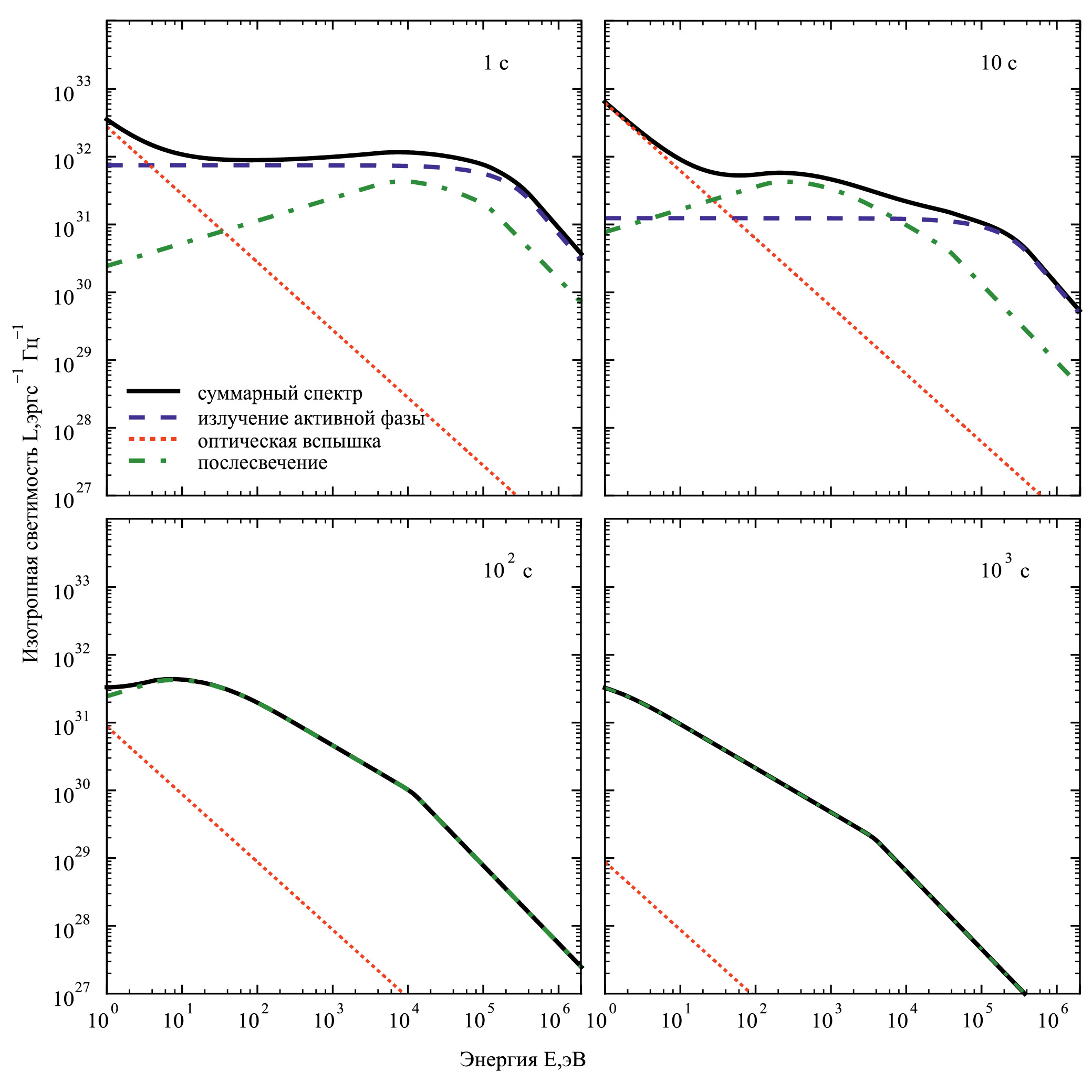 Рис. 1. Спектральная плотность светимости для разных компонент излучения гамма–всплеска (излучение активной фазы, оптической вспышки и послесвечения). По оси абсцисс отложена энергия фотонов в эВ, по оси ординат приведены значения изотропной спектральной плотности светимости в эрг с⁻¹ Гц⁻¹ (т.е. в предположении, что излучение распространяется в полный телесный угол 4≠). На графиках показана спектральная плотность светимости для четырех различных моментов времени: 1, 10, 10², 10³c.