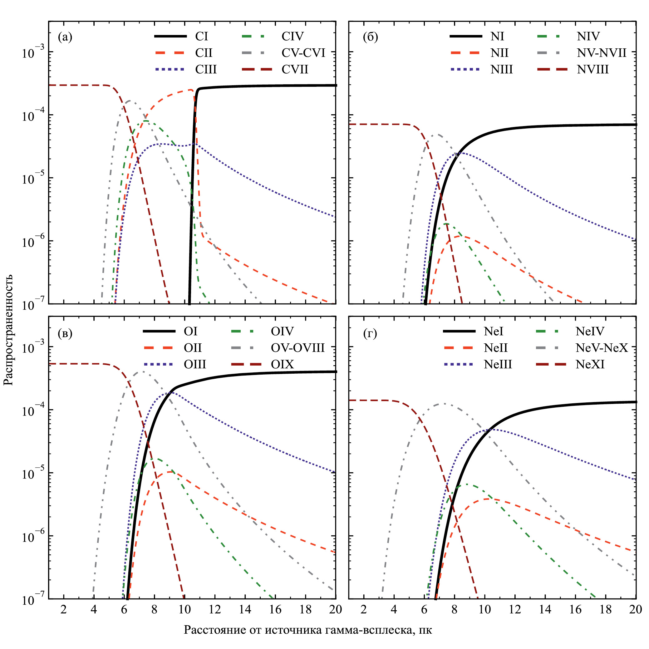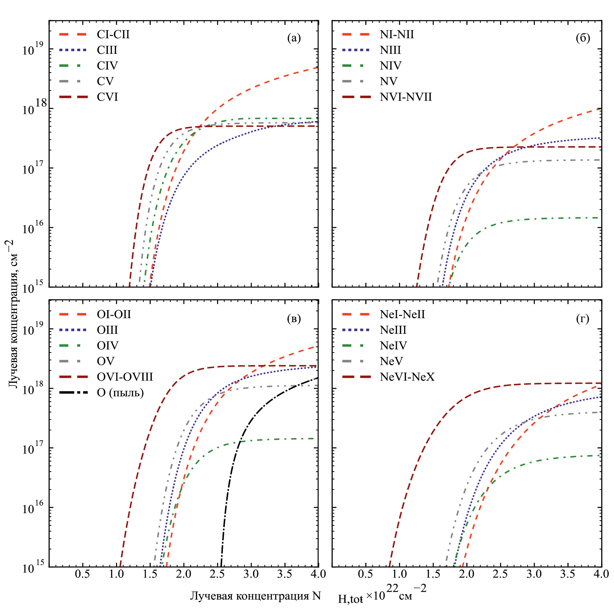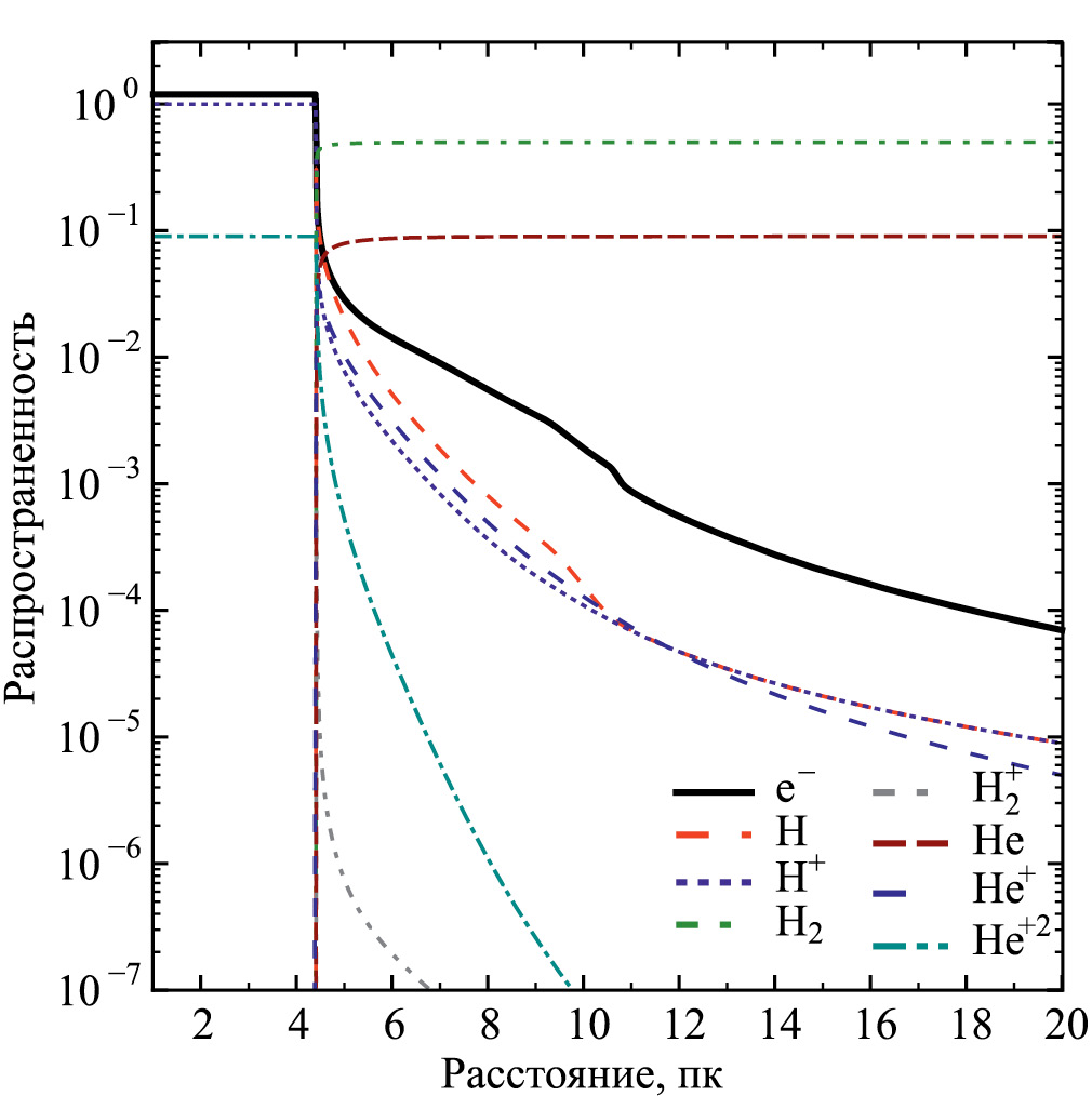 В расчетах учитываются химические элементы H, He, C, N, O, Ne, Mg, Si, S, Fe. Распространенность гелия принята равной 0.09. Распространенность металлов соответствует распространенности в Солнечной системе, и делается поправка на принятое значение металличности [M/H] ≡ log10 (Z/Z⊙). Результаты расчетов, показанные на рисунках, соответствуют значению параметра [M/H] = 0; результаты расчетов для значений металличности [M/H] = – 1 и – 2 обсуждаются в тексте статьи. Распространенность химических элементов в случае [M/H] = 0 приведена в табл. 3 (Лоддерс, 2021). В начальный момент все атомы и молекулы H₂ находятся в нейтральном состоянии, концентрация атомов Н равна 0.