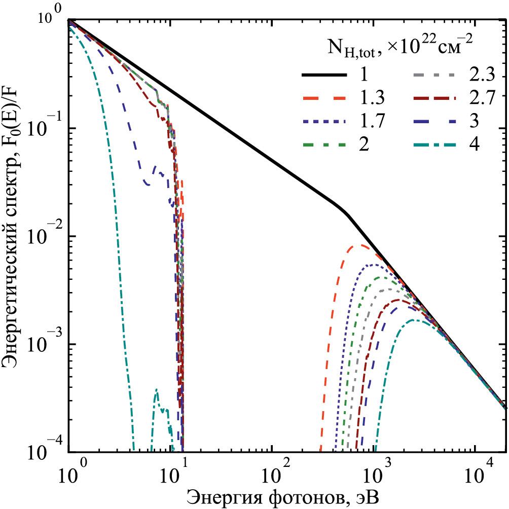 По поглощению послесвечения гамма–всплеска в рентгеновской части спектра можно оценить лучевую концентрацию водорода NHX. Причем в этих оценках обычно предполагается, что излучение поглощается ионами металлов. Было обнаружено, что лучевые концентрации NHX, как правило, на порядок и более превышают лучевые концентрации водорода NH, вычисленные по данным в оптическом диапазоне длин волн — по линиям атомарного водорода, линиям ионов металлов, или AV (Уотсон и др., 2007; Кампана и др., 2010, 2012). Одно из решений несоответствия наблюдаемых значений лучевых концентраций водорода заключается в том, что излучение в рентгеновском диапазоне длин волн поглощается в слое ионизованного газа вблизи источника гамма–всплеска (Шади и др., 2011; Кронгольд, Прочаска, 2013). Ионы металлов, которые имеют большой заряд, вносят вклад в величину поглощения послесвечения в рентгеновской части спектра, однако не видны в оптическом и ультрафиолетовом (УФ) диапазонах длин волн. Это объяснение подтверждается тем, что анализ переменности профилей абсорбционных линий ионов металлов с малым зарядом в послесвечении гамма–всплесков указывает на то, что облака нейтрального газа находятся на расстоянии ∼100–1000100–100 пк от источника всплеска (например, Вресвийк и др., 2007). Были предложены другие объяснения наблюдаемого поглощения излучения послесвечения в рентгеновском диапазоне — поглощение ионами He в HII области, где произошел гамма–всплеск (Уотсон и др., 2013). Диффузная межгалактическая среда и абсорбционные системы на луче зрения вносят существенный вклад в поглощение излучения для гамма–всплесков на красных смещениях z ⩾ 3 (Сталинг и др., 2013; Рахин, Бехар, 2019).