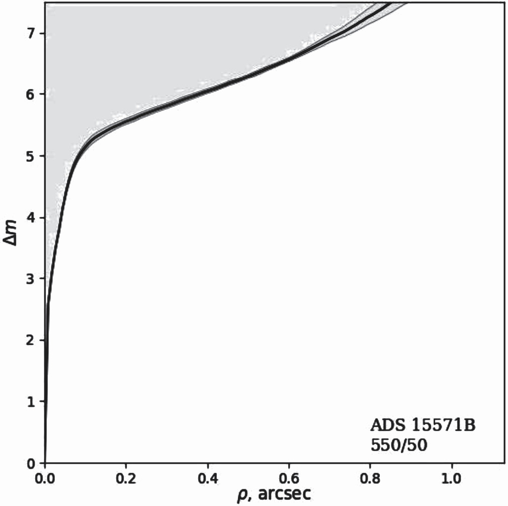 Рис. 2. Возможность обнаружения спутника у звезды ADS 15571 B с помощью спекл-интерферометрии на телескопе БТА в зависимости от разности блеска Dm и расстояния от звезды ρ. Черная линия — предельные значения для обнаружения спутника. Серые линии отображают ошибки определения пределов. Светло-серая область выше линии — значения, при которых обнаружение невозможно.