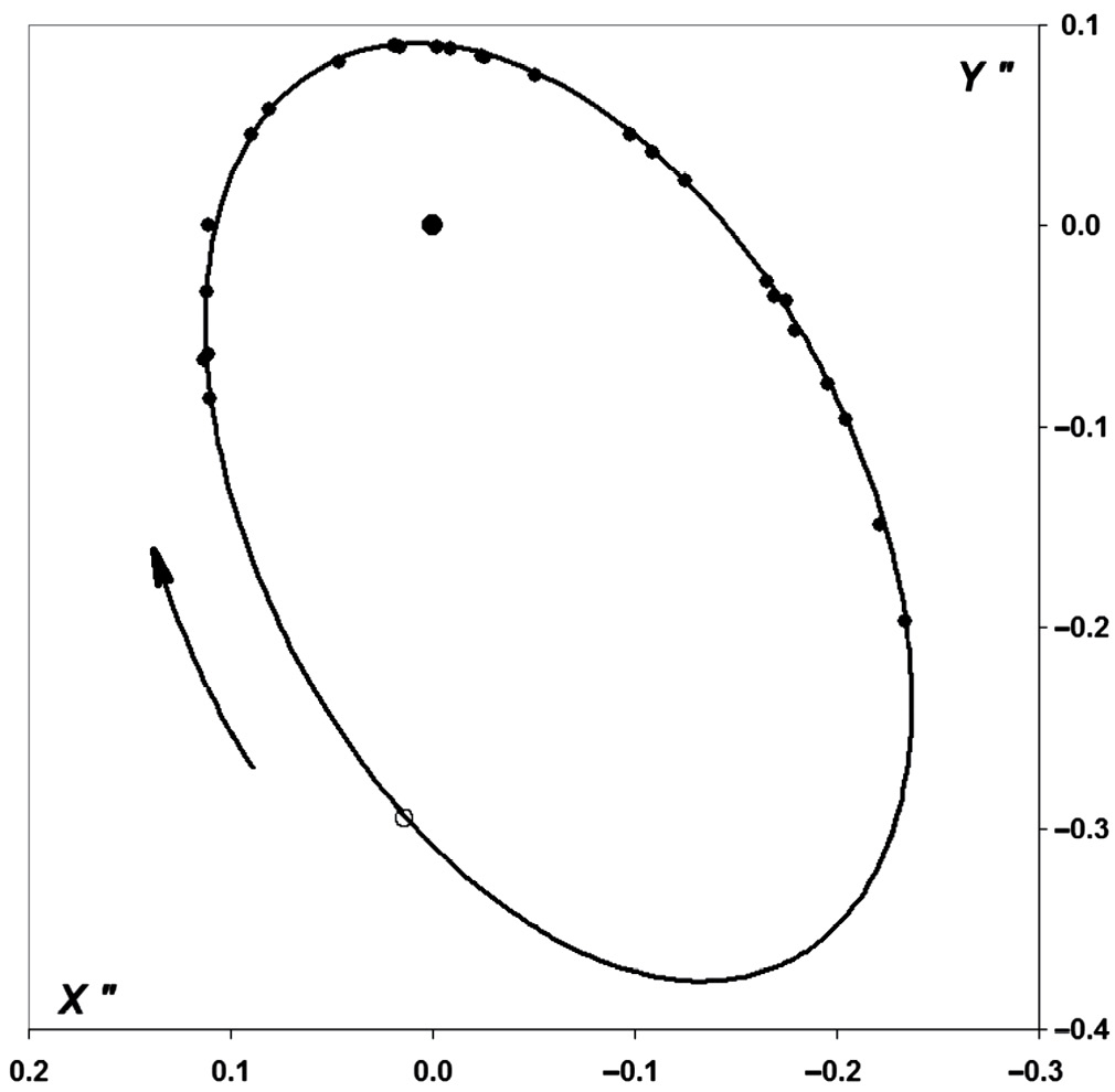 В нашем случае наблюдения охватывают геометрически около половины видимого эллипса, а динамически — около трети периода (наблюденная дуга приходится на область перицентра орбиты), что снижает надежность определяемой орбиты. Однако мы все-таки построили такой эллипс по нашим наблюдениям, и далее по видимому эллипсу с помощью ПГМ была построена орбита спутника относительно главного компонента — получены ее геометрические элементы. Для периода и момента прохождения перицентра в качестве начального приближения были взяты значения из работ Грошевой (2006, 2007). Однако точность построенной орбиты оказалась недостаточна: эфемериды, вычисленные по ней, плохо совпадали с наблюденными положениями. Вероятно, это связано с неточным построением видимого эллипса, что вызвано недостаточным охватом его наблюдений. Для уточнения орбиты было применено варьирование (“фитинг”) четырех элементов: наклонения, долготы восходящего узла, периода и момента прохождения перицентра. При этом применялся итерационный подход: по уточненной орбите строился видимый эллипс, его параметры уточнялись с целью лучшего соответствия наблюденным точкам, и по нему вновь определялась орбита. В результате нескольких таких итераций удалось получить орбиту со среднеквадратичным уклонением от наблюдаемых точек 0".003, что значительно лучше, чем удалось получить методом ПВД. Построенная с помощью ПГМ сумма масс системы должна быть также около 1.7 M¤.