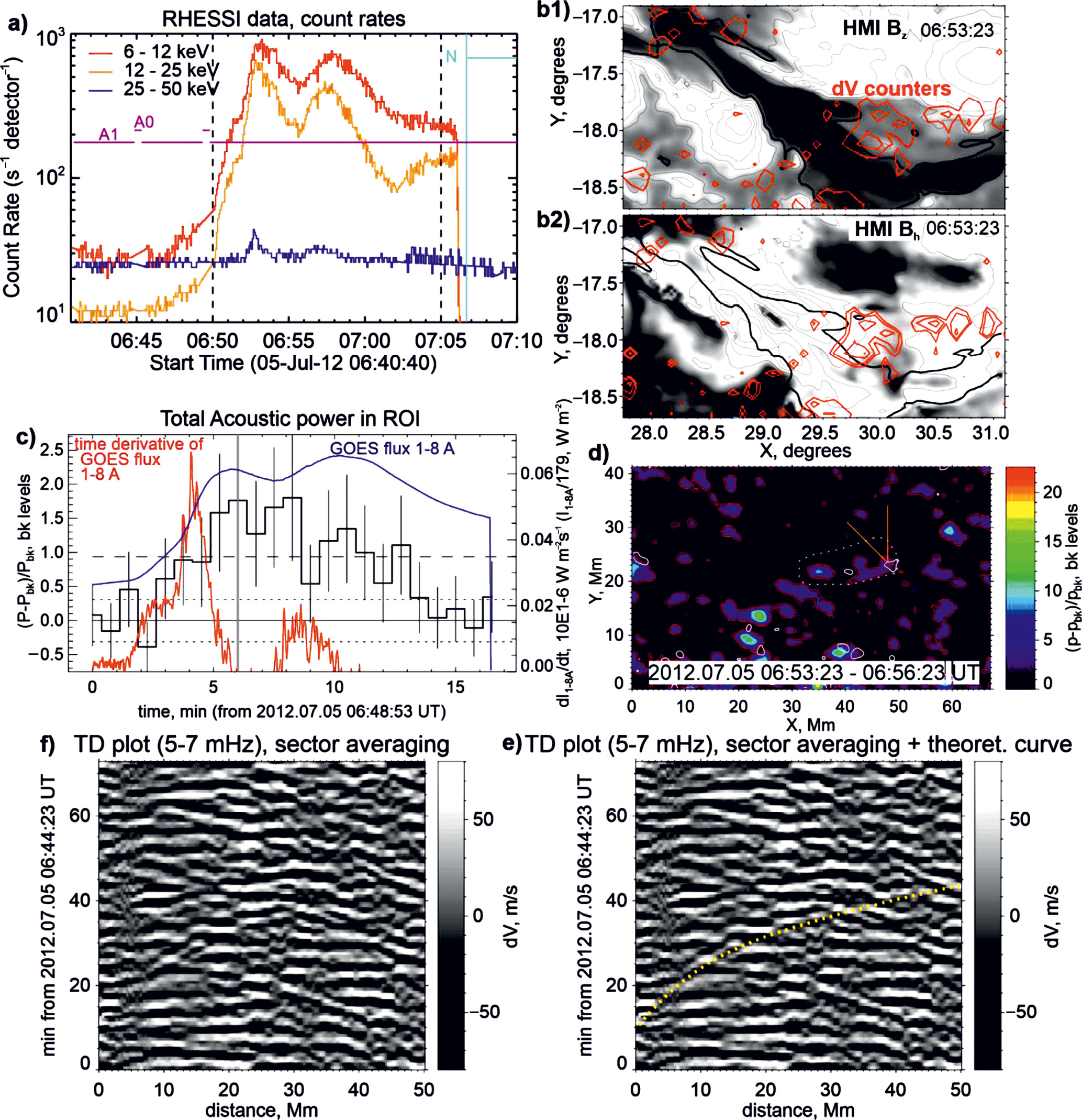 Рис. 1. Темпы счета по данным рентгеновского телескопа RHESSI в трех энергетических диапазонах показаны на панели (а). Красными контурами на (b) показаны возмущения скорости по лучу зрения на допплерограммах HMI, а черная линия – это НЛ. Черно-белая подложка на (b1) и (b2) соответствует картам вертикального и горизонтального магнитного поля, полученным из векторных магнитограмм HMI. Временной профиль динамики полной акустической мощности солнцетрясения (полученной с помощью метода гелиосейсмической голографии) показан черной гистограммой на панели (с). Черная линия на (с) показывает ноль, а штриховые – уровни 1 и 3 сигма. Cиним цветом показан поток рентгеновского излучения 1–8 Å по данным GOES, а производная обозначена красным цветом. Карта пространственного распределения акустической мощности приведена на (d), где штрих-пунктир ограничивает область, в которой мы считали акустическую энергию, показанную на (с). Белые контуры указывают возмущения допплеровской скорости. Желтые прямые линии ограничивают сектор усреднения для построения диаграмм время–расстояние (f–e), демонстрирующих распространение волн солнцетрясений. Желтый штрихпунктир (e) указывает теоретическую кривую распространения гелиосейсмической волны в рамках геометрической оптики. На (f) и (е) показаны абсолютно одинаковые диаграммы.