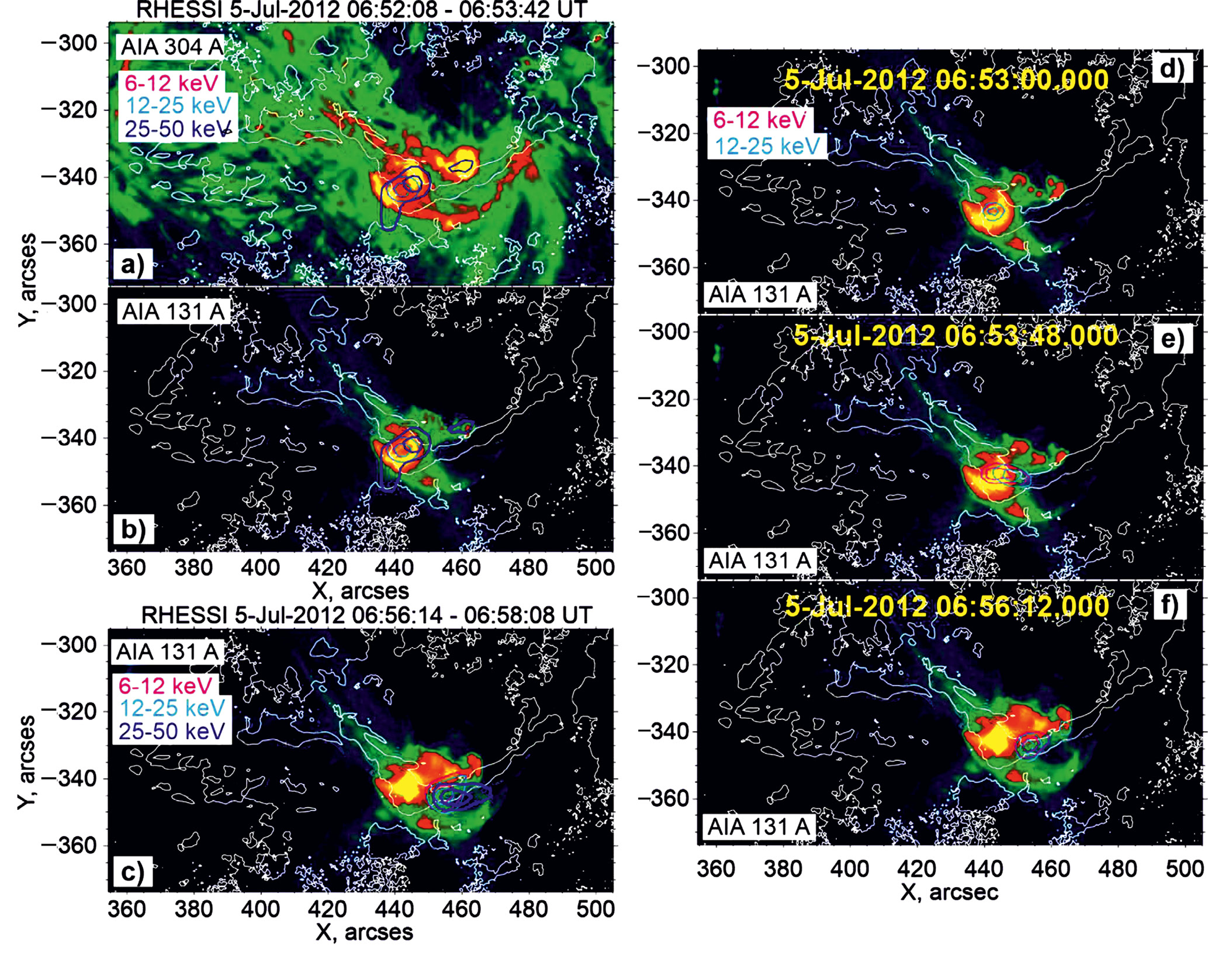 Рис. 2. Сравнение ЭУФ карт AIA 304 Å (а) и 131 Å (b)–(f) с рентгеновскими картами по данным RHESSI в разных диапазонах энергий (указаны соответствующим текстом на панелях): 6–12 (a)–(f), 12–25 (a)–(f) и 25–50 кэВ (a)–(c). Карты показывают пять разных моментов времени. Для панелей (a) и (b) показаны изображения для одного интервала времени.
