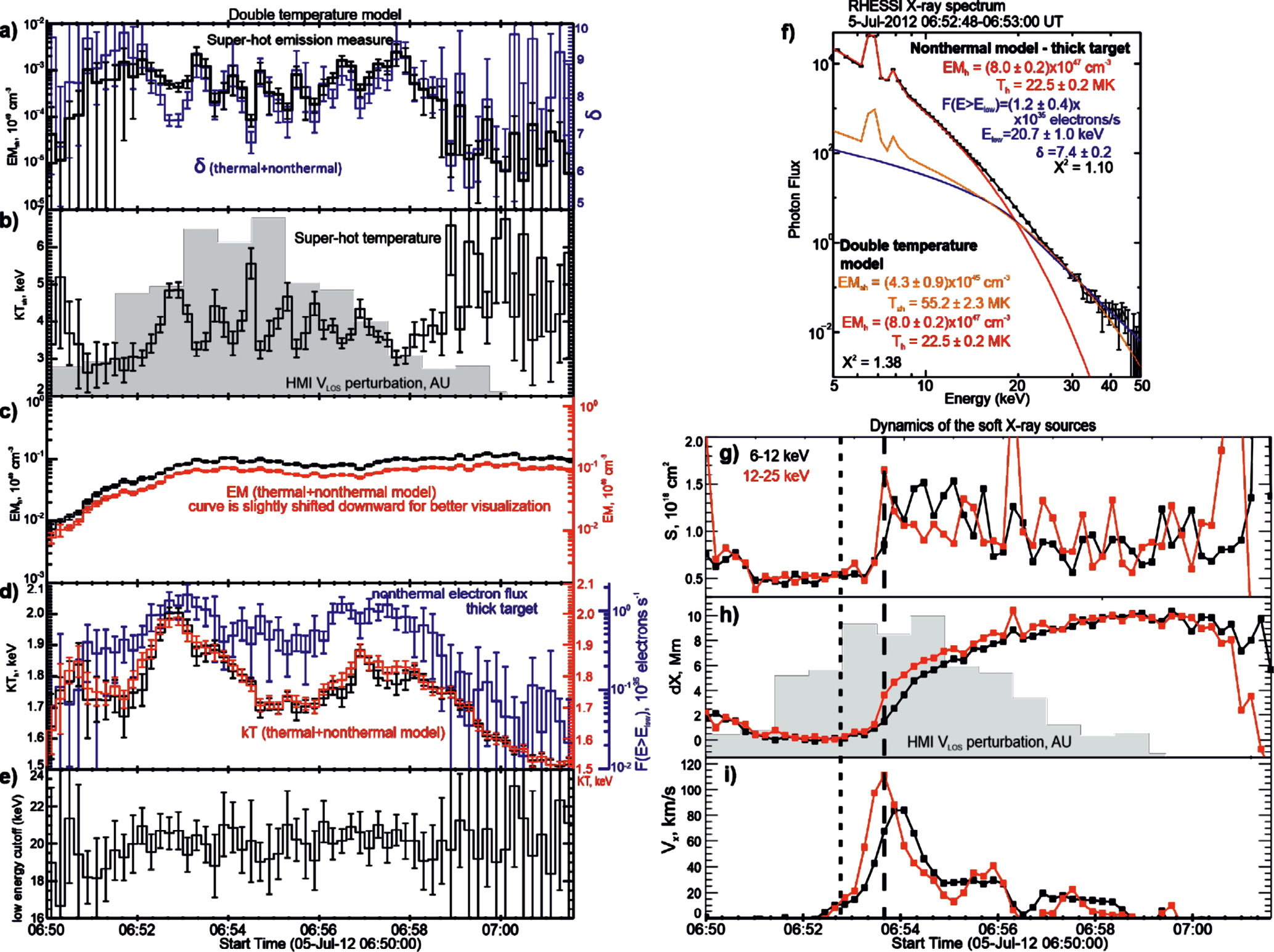 Далее мы будем рассматривать результаты анализа рентгеновских спектров. Ранее, в работе Зимовец и др. (2021) был проведен подробный анализ рентгеновских спектров и динамики рентгеновских источников для данного события. Тем не менее, мы частично повторим сделанную работу и проведем визуализацию результатов в контексте исследования солнцетрясения. На рис. 3 показаны результаты аппроксимации рентгеновских спектров, а также характеристик источников рентгеновского излучения в сравнении с динамикой фотосферного возмущения. Так как мы не можем получить достоверные оценки энергии солнцетрясения методом акустической голографии (см. предыдущую главу и рис. 1c–d), то мы будем непосредственно использовать допплерограммы HMI, чтобы проиллюстрировать динамику фотосферного возмущения. Причем возмущения на допплерограммах не отображают реальной скорости плазмы количественно, поскольку в пересыщенных пикселях HMI мы наблюдаем неверные расчеты скоростей по лучу зрения из-за искажения профиля линии Fe I. Поэтому далее мы будем использовать площадь пересыщенных пикселей на Допплерограммах как количественный параметр масштаба фотосферного возмущения (см. гистограммы на рис. 3b,h).