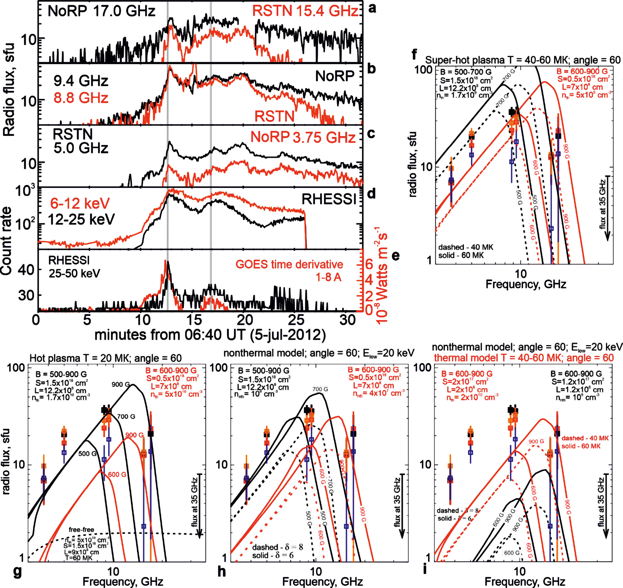 Рис. 4. Анализ микроволнового радиоизлучения по данным NoRP и RSTN. Показаны временные профили NoRP и RSTN (a)–(с) в сравнении с данными RHESSI (d)–(e) и временной производной потока рентгеновского излучения 1–8 Å по данным GOES (красный цвет на (e)). Панели (f)–(i) показывают микроволновые спектры (точки с ошибками) для четырех моментов времени (10, 12, 17 и 20 мин на (а)–(е): синий, черный, красный и оранжевый). Модельные спектры однородных источников показаны сплошными или штриховыми линиями. Параметры источников подписаны непосредственно на панелях.