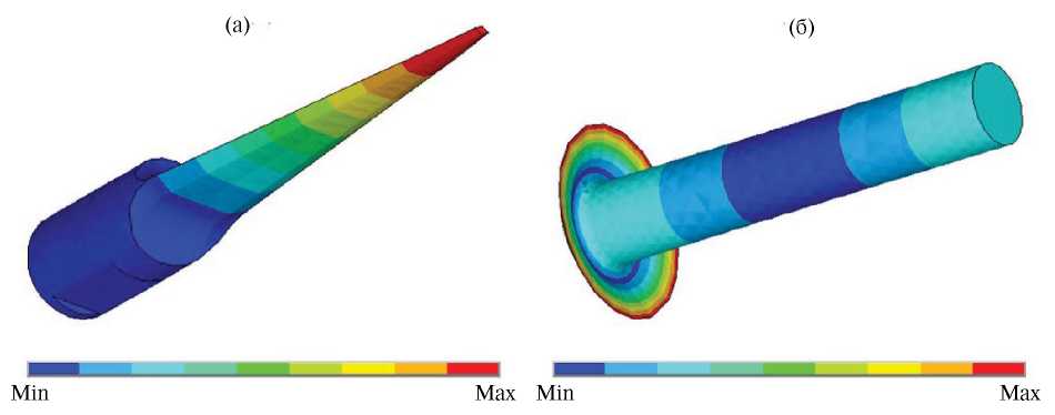 Перечисленные варианты геометрии ультразвуковых инструментов были исследованы с помощью МКЭ: свободные колебания были проанализированы с применением Ansys Multiphysics для следующих параметров материала: модуль Юнга, плотность и коэффициент Пуассона титана E = 110 ГПа, ρ = 4500 кг/м3, ν = 0.3; для анализа был использован 3D-элемент с 10 узлами. Во всех случаях анализировалась основная продольная мода. На рис. 3а–3б в качественном виде приведены результаты моделирования рассматриваемых основных мод колебаний треугольного и дискового инструмента.