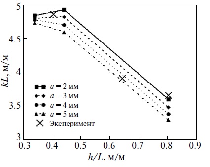 На рис. 5 представлена зависимость между волновой длиной kL и относительной длиной режущей части h/L для 7 точек, на рис. 6 представлена зависимость между волновой длиной kL и относительной длиной режущей части h/L для трех точек с изменяемым параметром ширины торца a, которым соответствуют описанные в предыдущем разделе модели. С помощью данных зависимостей можно определить геометрические параметры треугольного ножа с выбранной рабочей частотой и необходимой для конкретной технологии длиной режущей части и шириной торца. Как видно, по мере увеличения относительной длины режущей части волновой размер инструмента kL для большей части кривой уменьшается, но также видно, что эта функция имеет максимум вблизи h/L = 0.4 – при таком соотношении h и L волновой размер инструмента достигает максимума. Для оптимизации геометрии ножа необходимо учитывать особенности этой зависимости. Как видно на рис. 6, с увеличением ширины торца а волновой размер инструмента kL уменьшается, максимальное уменьшение волнового размера при увеличении значения параметра a от 2 до 5 мм, составляющее около 8.5%, наблюдается для максимальной рассмотренной относительной длины режущей части вблизи h/L = 0.8. Для оптимизации геометрии ножа также необходимо учитывать, что амплитуда ультразвуковых колебаний больше для геометрии с меньшей шириной торца а, так как выше коэффициент усиления. На графики также нанесены точки, соответствующие экспериментально полученным значениям для изготовленных треугольных ножей, которые подтверждают характер полученных зависимостей.