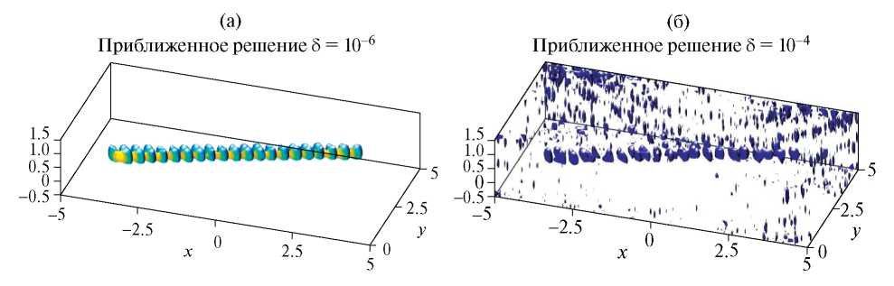 Рис. 7. Приближенные решения для разных уровней ошибок данных: (а) – δ = 10–6, (б) – δ = 10–4.