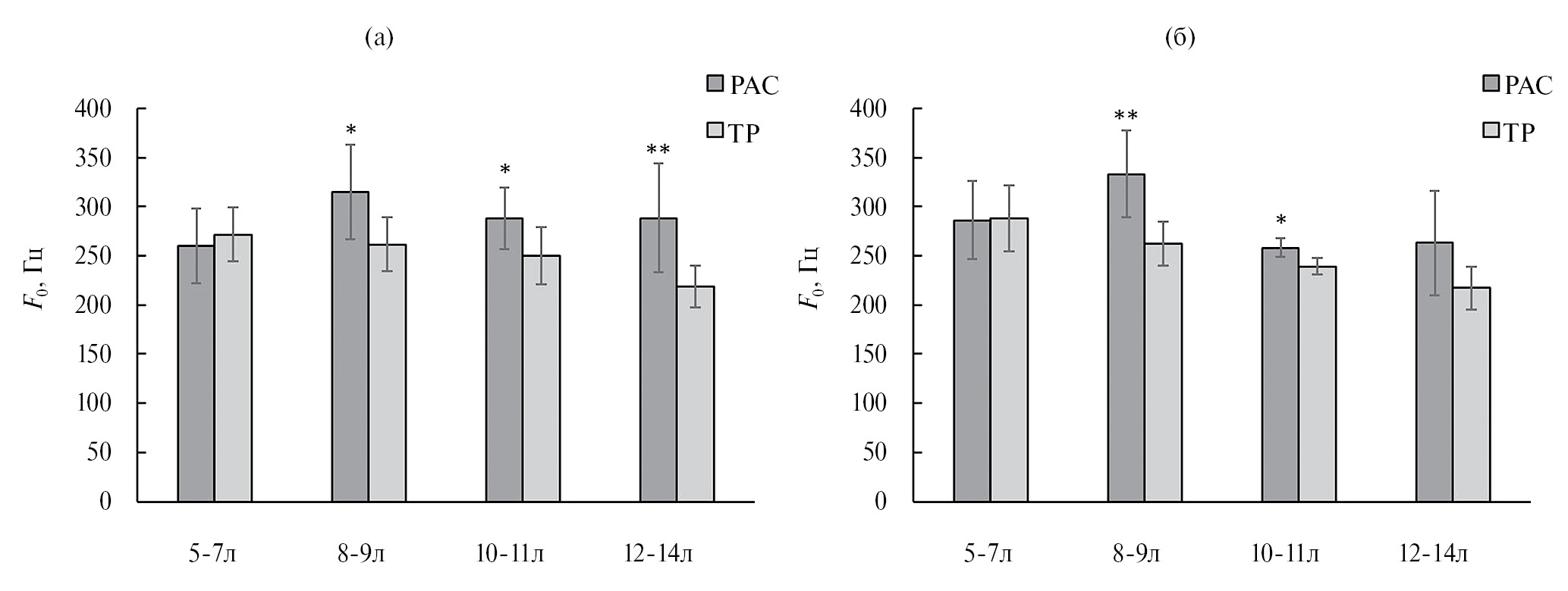 Рис. 5. Значения ЧОТ (а) — ударных и (б) — безударных гласных из фраз детей с РАС и ТР детей. * — p < 0.05; ** — p < 0.01 — критерий Манна—Уитни.