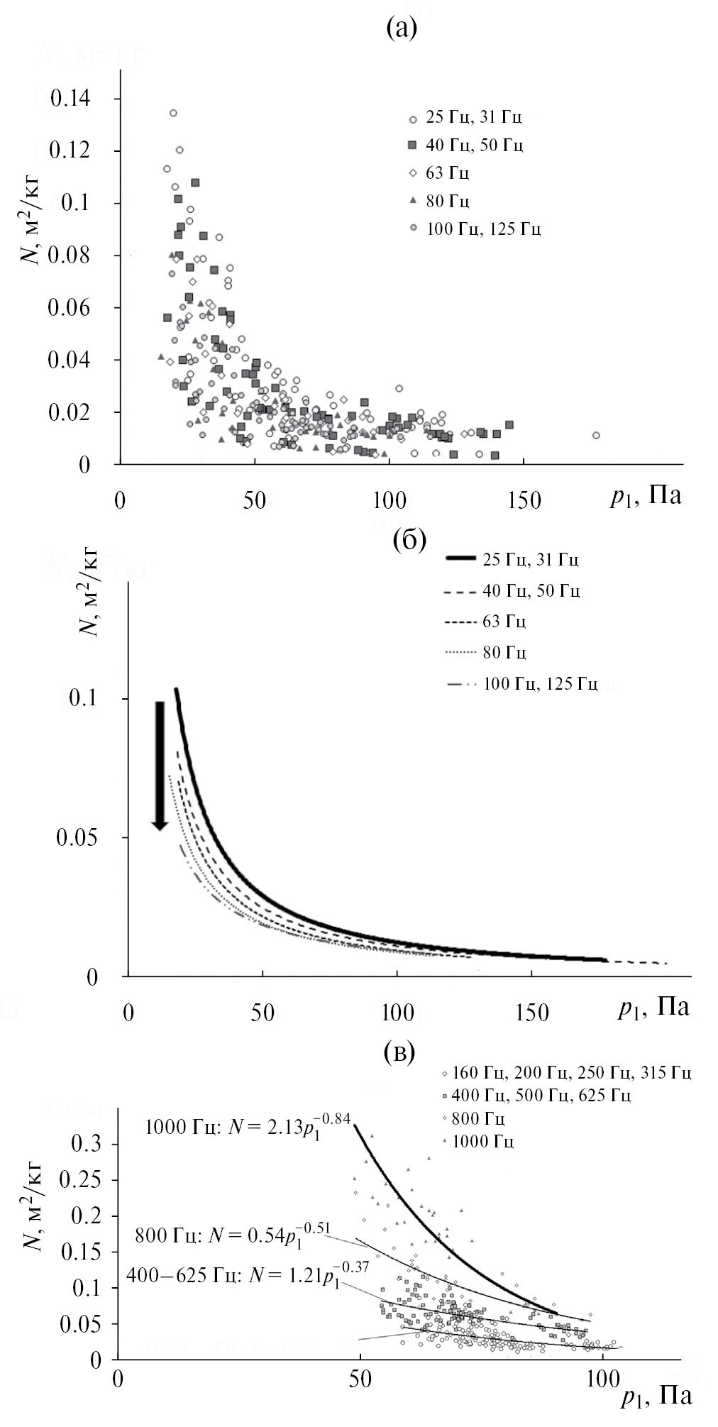 Из рис. 6 видно, что, как и при натурных испытаниях, особенно на низких частотах, наблюдалась тенденция ПАВ к понижению при росте внешнего акустического нагружения по степенному закону, что подтверждает объективность изучаемого явления.