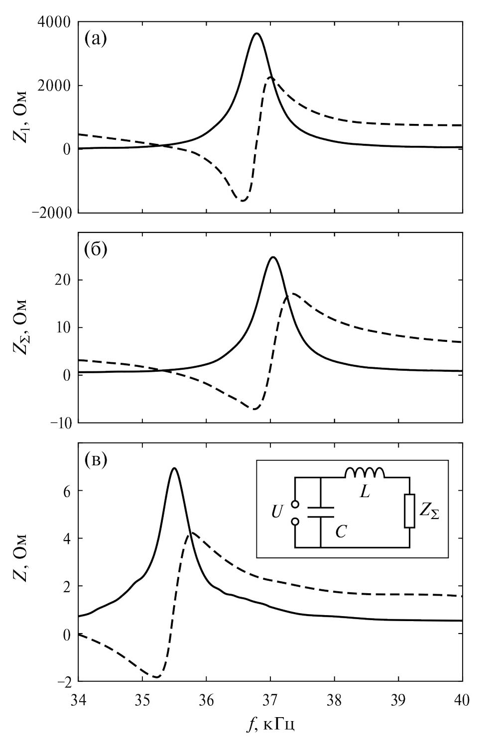 Рис. 2. (а) – частотные зависимости действительной (сплошная линия) и мнимой (штриховая) части импеданса Z1 одного элемента решетки, (б) – импеданса ZΣ параллельно соединенных 128 элементов решетки, (в) – импеданса Z решетки с подключенным согласующим устройством; на вставке показана схема устройства, согласующего источник напряжения U c электрической нагрузкой ZΣ