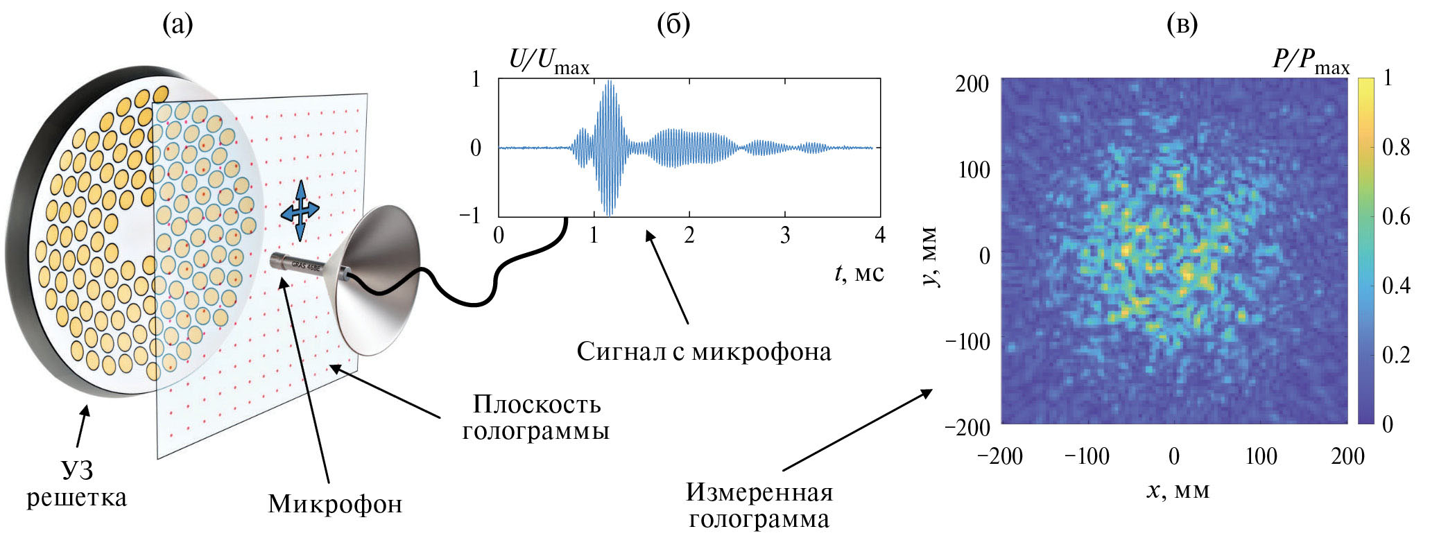 В ходе сканирования при записи сигнала микрофона в каждой точке голограммы на элементы решетки подавались одинаковые электрические сигналы. Они имели вид радиоимпульсов с синусоидальным заполнением на частоте 35.5 кГц, длительностью 20 периодов и с плавным нарастанием и затуханием огибающей. Для уменьшения шумов проводилось усреднение по 16 реализациям в импульсно-периодическом режиме, при этом период повторения импульсов составлял 10 мс. Электрический сигнал микрофона регистрировался с помощью осциллографа TDS5054B (Tektronix Inc., США). Запись сигнала производилась в пределах временного окна длительностью 4 мс: указанной длительности было достаточно для записи принимаемого микрофоном импульсного акустического сигнала. Шаг дискретизации сигнала был равен 1.6 мкс, что для выбранного временного окна соответствовало 2500 точкам записи. Типичный вид регистрируемого микрофоном сигнала в одной из точек плоскости голограммы при импульсном возбуждении элементов решетки представлен на рис. 3б.