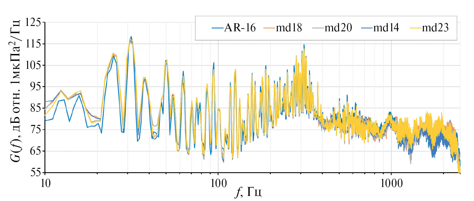 Рис. 4. Спектр акустического шума, измеренный опорным АПАР № 16 (голубая линия) и приведенные к нему спектры шумов, измеренные МД № 18, 20, 14, 23