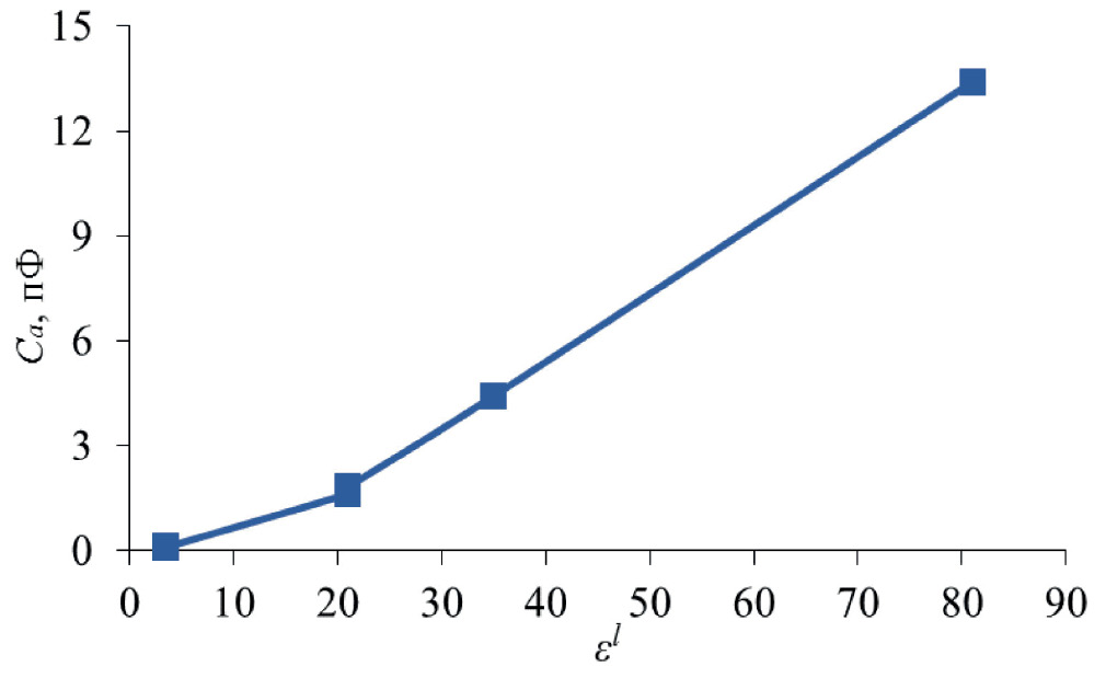 Ранее было сделано предположение о том, что проводимость и диэлектрическая проницаемость жидкости, в которую погружен резонатор, влияют на величину эффективной площади его электродов. В процессе фиттинга авторы ограничились определением эффективной емкости погруженного в жидкость резонатора в первичной цепи его эквивалентной схемы (рис. 4). Было установлено, что добавочная емкость C01 существенно выше для таких жидкостей, как вода, этиловый спирт, ацетон и изопропиловый спирт с высокими показателями относительной диэлектрической проницаемости εl, чем для жидкостей с низкой εl (керосин, вазелиновое масло, уайт-спирит). С ростом диэлектрической проницаемости жидкости εl значение краевой добавочной емкости Ca увеличивается (рис. 8).