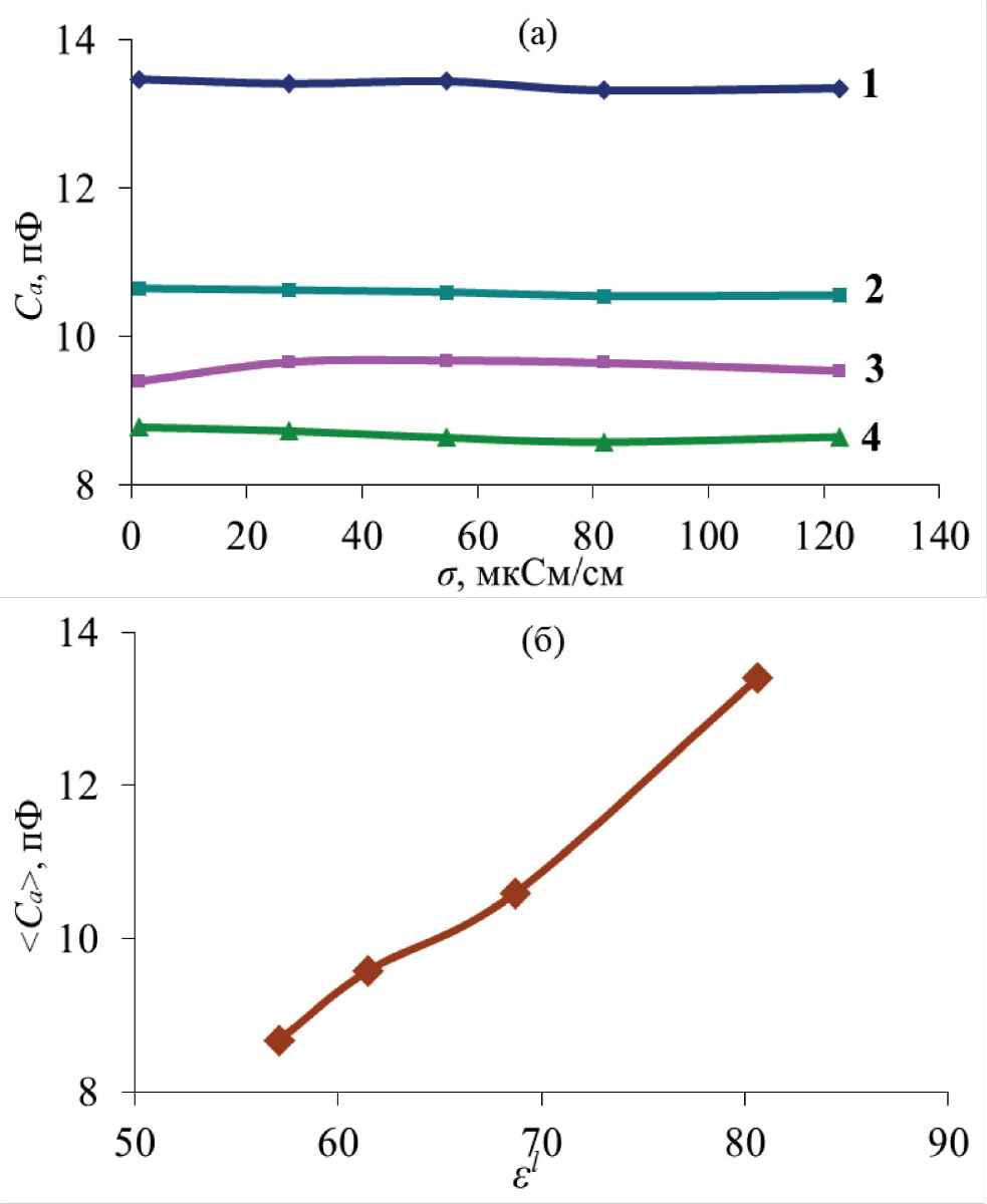 Рис. 9. (а) – Зависимости добавочной емкости Ca от проводимости жидкостей: 1 – вода, 2 – смесь вода-глицерин β=44%, 3 – смесь вода-глицерин β=65%, 4 – смесь вода-глицерин β=75%. (б) – Зависимость арифметически средних по проводимости значений для каждой смеси добавочной емкости <Ca> от экспериментально полученного значения εl.