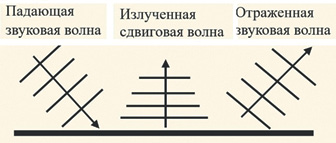 Рис. 2. Генерация сдвиговой волны при отражении от плоскости звуковой волны (прямой эффект Константинова) [18].
