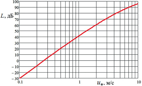 Рис. 9. Зависимость уровня излучаемой мощность с единичной площади от скорости.