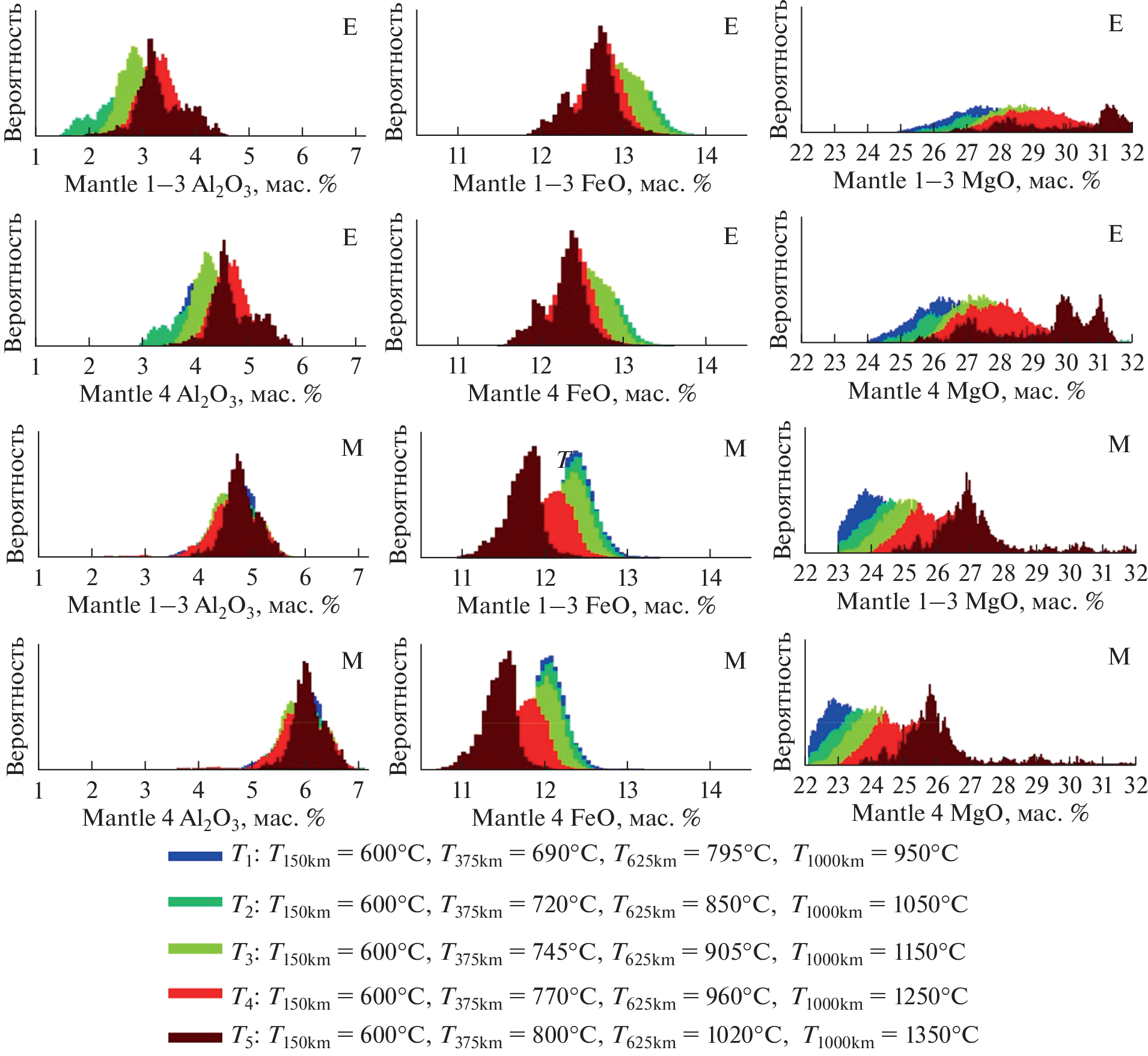 There are serious contradictions between the geophysical and geochemical classes of models of the chemical composition and internal structure of the Moon, associated with the assessment of the abundance of the main oxides. The search for a potential consensus between the models was carried out on the basis of a set of geophysical and geochemical data using the Monte-Carlo method using the Markov chain scheme in combination with a method of minimization of the Gibbs free energy. The influence of the chemical composition and mineralogy of several conceptual models on the internal structure of the Moon has been studied. Two classes of chemical composition models are considered—the E models with terrestrial values of Al2O3 and CaO and M models with their higher content, as well as two classes of the most popular geochemical models, the Taylor Whole Moon (TWM) and Lunar Primitive Upper Mantle (LPUM) models, with ~45 wt % SiO2, but with different concentrations of refractory oxides and FeO. In both classes of E and M models, the lunar mantle is enriched in silica (~50 wt % SiO2) and FeO (11–13 wt %, Mg# 79–81) relative to the bulk composition of the silicate Earth (BSE, ~45 wt % SiO2, ~8 wt % FeO, Mg# 89). Such high concentrations of SiO2 and FeO become the determining factors for understanding the features of the mineral, velocity, and density structure of the lunar mantle. For the E and M models and geochemical models TWM and LPUM, the speed of sound and the density of stable phase associations are calculated. For E and M models, good agreement was obtained between the velocities of P- and S-waves and seismic sounding data from the Apollo program, which supports the idea of a silica-rich (olivine-pyroxenite) upper mantle. Unlike the Earth’s upper mantle, the dominant mineral in the Moon’s upper mantle is low-calcium orthopyroxene, not olivine. In contrast, the sound velocities of silica-unsaturated compositions, both FeO and Al2O3 enriched (TWM) and depleted (LPUM) models, do not match the seismic signatures. Thermodynamically justified restrictions on the chemical composition, mineralogy, and physical characteristics of the mantle based on the E and M models make it possible to eliminate some contradictions between the geochemical and geophysical classes of models of the internal structure of the Moon. Simultaneous enrichment in ferrous iron and silica is difficult to reconcile with the hypothesis of the formation of the Moon as a result of a giant impact from the substance of the Earth’s primitive mantle or from the substance of a shock body (bodies) of chondrite composition. Limitations on lunar concentrations of FeO and SiO2 probably correspond to the parent bodies of some achondrites.