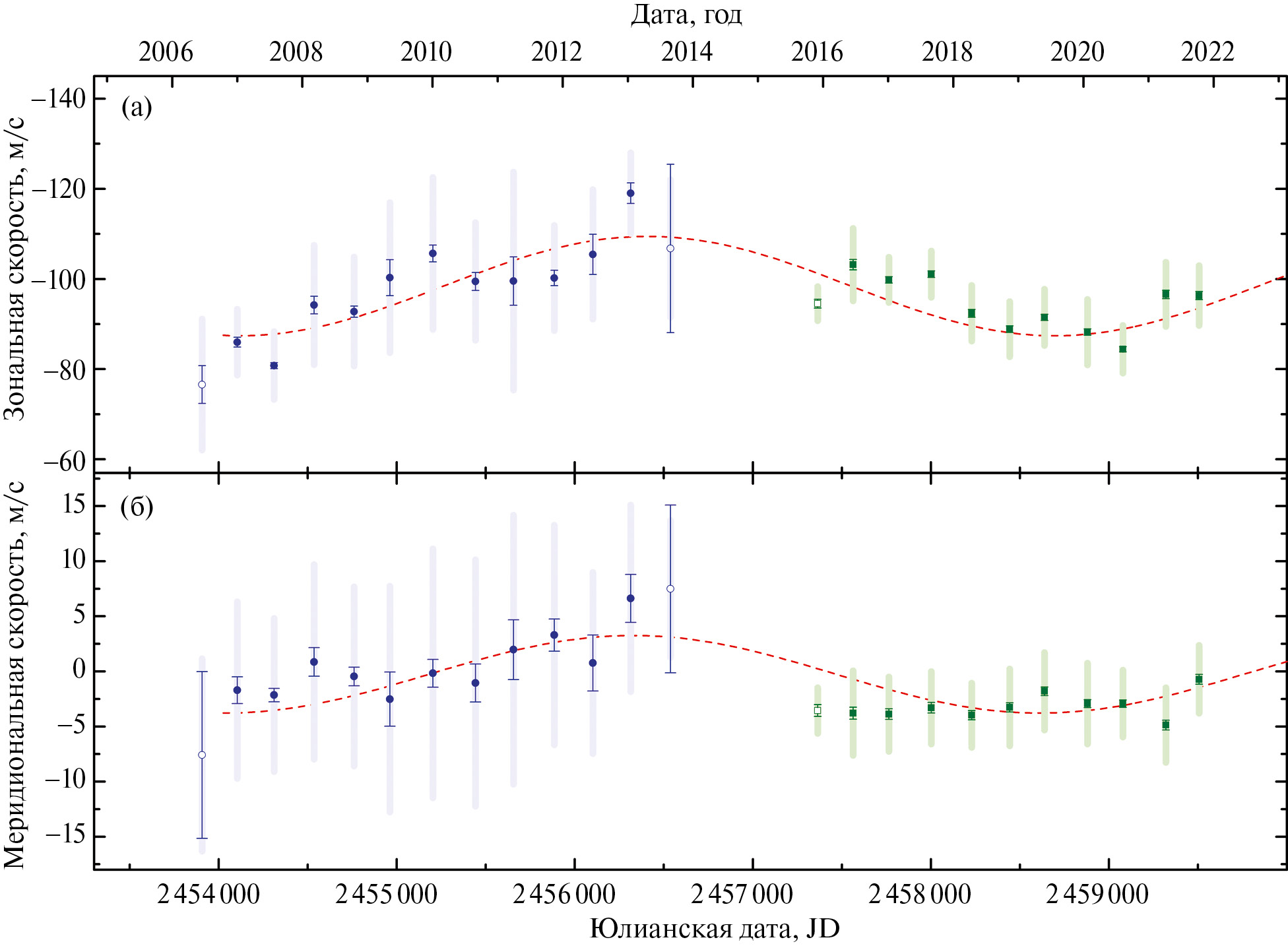 В (Khatuntsev и др., 2022) были исследованы долговременные вариации средней зональной и меридиональной скоростей ветра в околополуденное время с 2006 по 2021 гг. для параллели 20° ± 2.5° ю. ш. При помощи метода Лафлера–Кинмана (Lafler, Kinman, 1965) была обнаружена периодичность с периодом 12.5 ± 0.5 земных года. Амплитуда аппроксимирующей синусоиды для зональной компоненты составила 10.0 ± 1.6 м/с относительно среднего –98.6 ± 1.3 м/с. Периодичность демонстрировала и меридиональная компонента. В (Khatuntsev и др., 2022) ограничения по фазовому углу для данных UVI не учитывались.