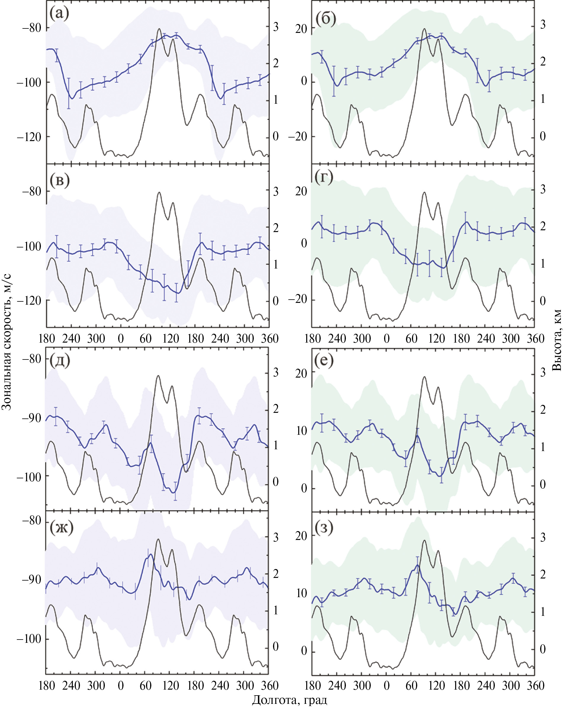 Рис. 3. Долготные вариации средней зональной скорости ветра, усредненные за временные интервалы, соответствующие шести венерианским годам и полученные по изображениям VMC ((а) и (в)) и UVI ((д) и (ж)) в широтной полосе 10° ± 5° ю. ш. Долготные вариации остаточного ряда u–u12.5 зональной скорости после вычитания синусоиды для VMC ((б) и (г)) и UVI ((е) и (з)). Ошибка соответствует 99.6% доверительному интервалу (3). Светло-голубая и светло-зеленая области соответствуют стандартному отклонению σ. Средняя высота рельефа поверхности в той же широтной полосе показана черной кривой.