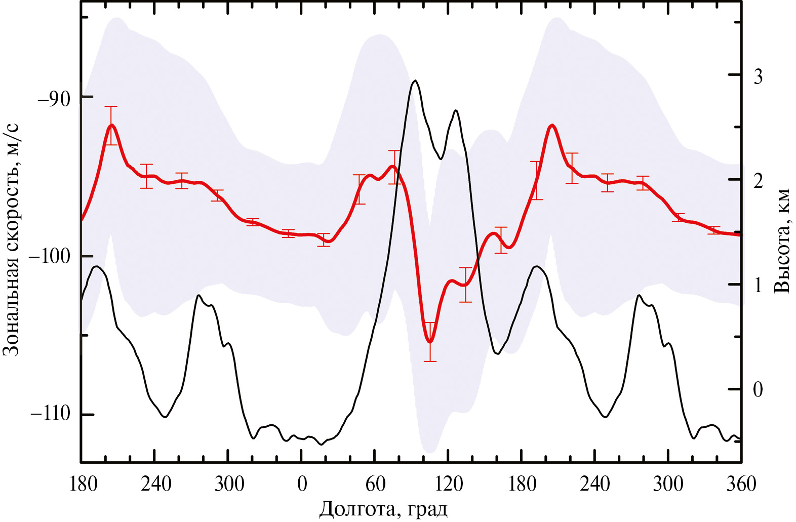 Анализ результатов, полученных визуальным методом по УФ-изображениям южного полушария Венеры при наблюдениях с VMC (Khatuntsev и др., 2013), позволил установить корреляцию скорости зонального ветра с рельефом подстилающей поверхности в широтном интервале 10° ± 5° ю. ш. (Bertaux и др., 2016). Было показано, что расположение минимума средней скорости зонального ветра коррелирует с возвышенностями на западе Земли Афродиты (область Овды), обширным “материковым” массивом, простирающимся вдоль параллели 10° ± 30° ю. ш. от 50° до 210° в. д. Следуя Lindzen (1981) и Young и др. (1987), Bertaux и др. (2016) объяснили замедление зонального потока воздействием гравитационных волн, возникающих при обтекании препятствия горизонтальным потоком у поверхности, с их последующим распространением вверх и передачей момента зональному потоку. Было высказано предположение, что средняя зональная скорость увеличилась за время миссии в связи с тем, что долгота подспутниковой точки медленно дрейфовала от орбиты к орбите на запад, от горной области Овда к низменности.