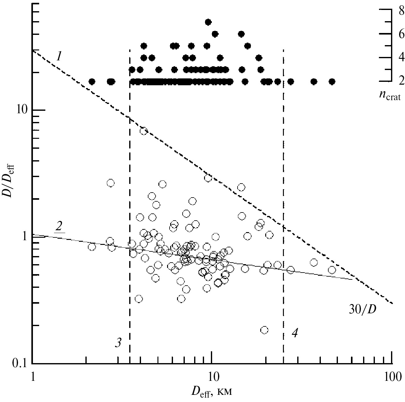 Рис. 3. Зависимость от эффективного диаметра пары (или кластера) кратеров, Deff, отношения L/Deff, где L – максимальное удаление центра наименьшего кратера (в паре или кластере) от центра главного кратера. В верхней части рисунка черными точками показано число кратеров, распознающихся на месте удара. Пунктир (1) – видимая линия ограничения расхождения L~30 Deff. Линия регрессии 2 соответствует соотношению (3). Вертикальные пунктирные линии ограничивают диапазон эффективных диаметров структур от ~2.5 км (3) до ~25 км (4).