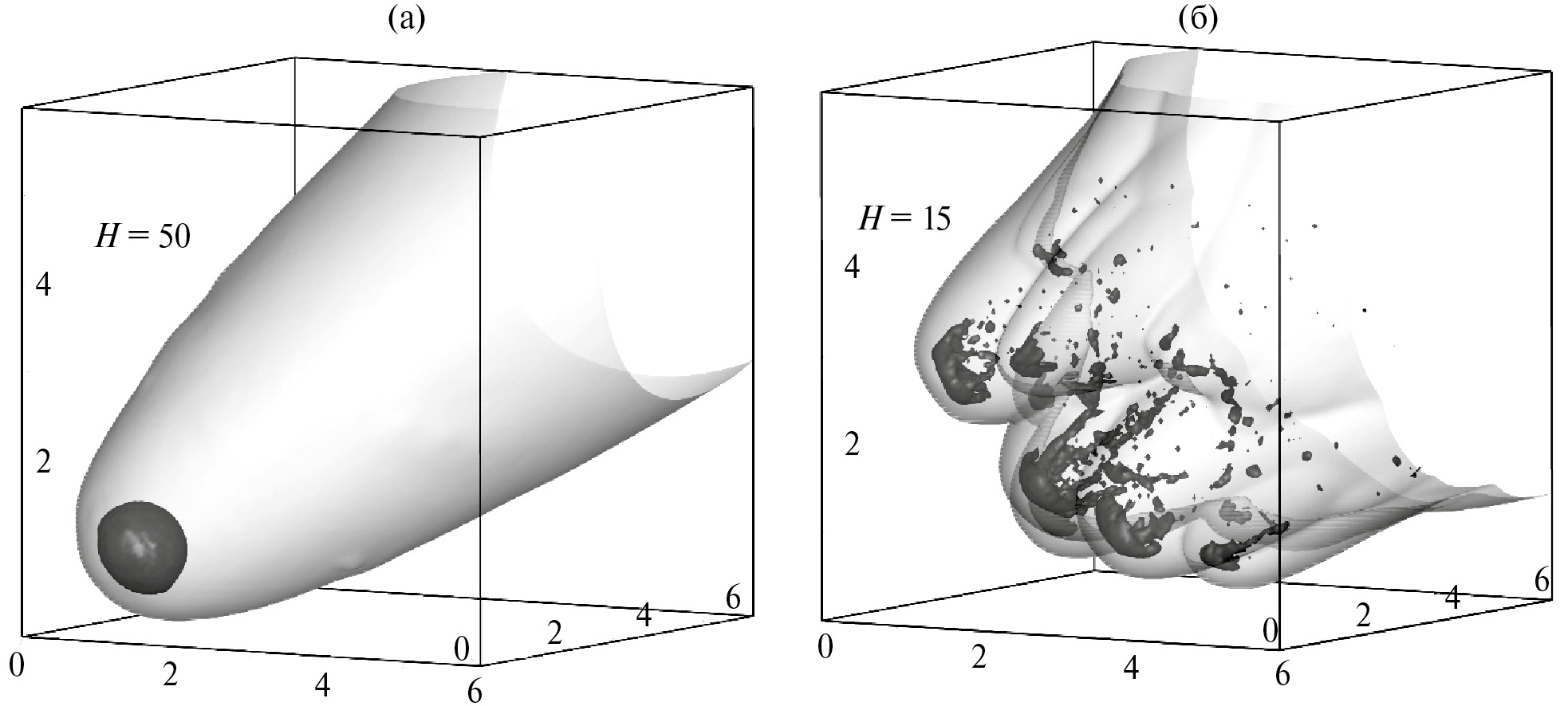 Для иллюстрации результатов рассмотрим вариант расчета, в котором астероид с начальным диаметром 1 км падает под углом 45°. На рис. 6 показана форма астероида и окружающей его баллистической ударной волны на высотах 50 и 15 км. На высоте 50 км астероид начал слегка деформироваться, его скорость близка к начальной, 20 км/с. На высоте 15 км астероид разрушился, образовалось несколько крупных фрагментов и много мелких. При этом фрагменты еще окружены общей ударной волной, хотя на ее фронте выделяются выпуклости, соответствующие крупным фрагментам. Скорость астероида к этому моменту уменьшилась до 14 км/с. Структура облака фрагментов на высоте 15 км сильно отличается от полученной в двумерном расчете и показанной на рис. 5.