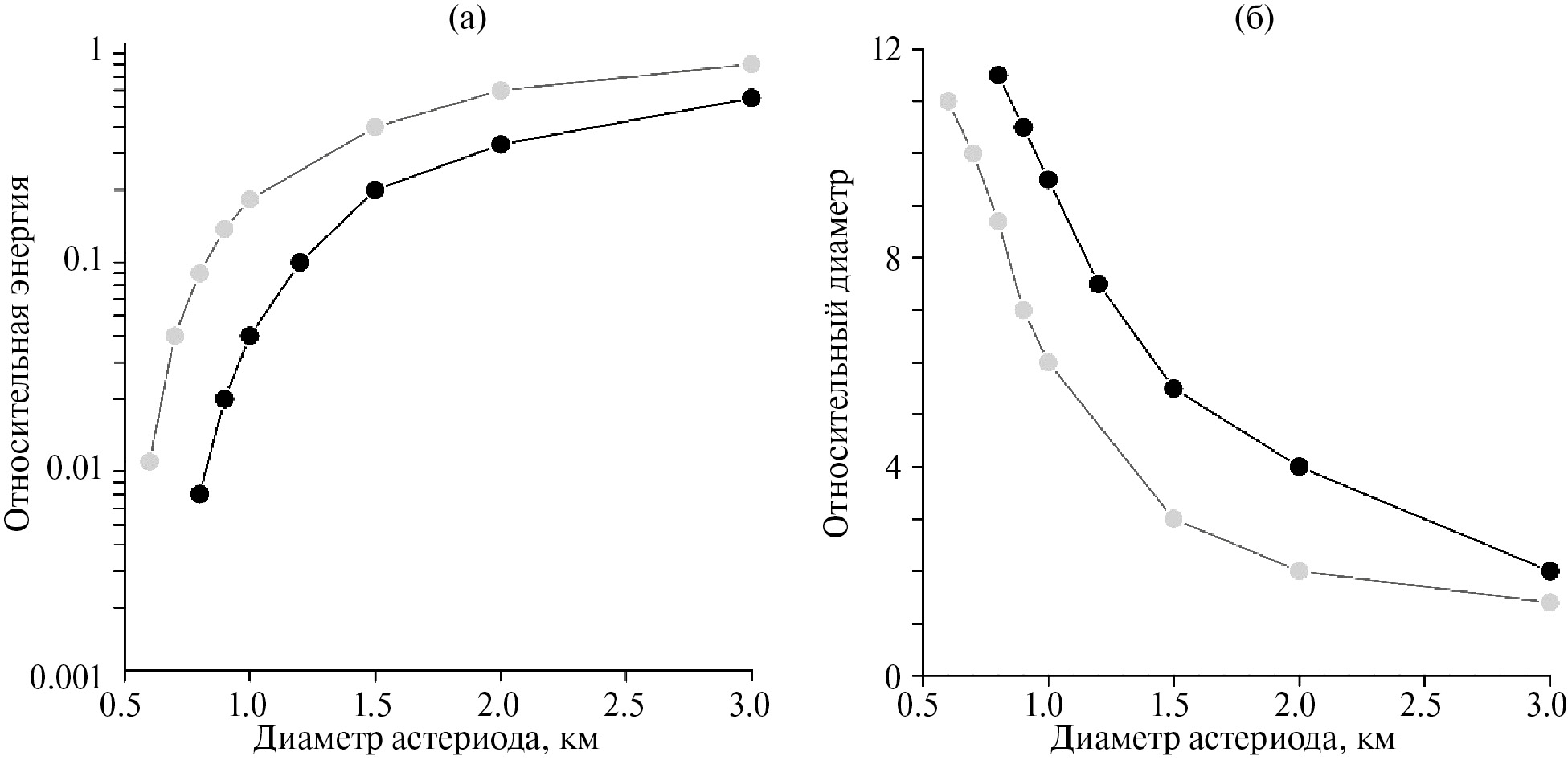 На рис. 9 показаны зависимости от высоты относительной энергии и эффективного диаметра астероида (или облака его фрагментов) для астероидов разного начального диаметра D0, падающих под углом 45°. Эффективный диаметр определялся как диаметр цилиндра, ось которого совпадает с главной диагональю куба, параллельной траектории, и внутри которого сосредоточено 95% массы астероида. Даже трехкилометровые астероиды теряют 49% своей энергии при пролете через атмосферу и заметно деформируются (расплющиваются), их диаметр увеличивается примерно в 2 раза. Астероиды размером 0.8 км и меньшие теряют практически всю свою энергию (более 99%) при пролете через атмосферу. Максимальный диаметр облака фрагментов, которое еще способно образовать кратерное поле, составляет 10–12 D0.