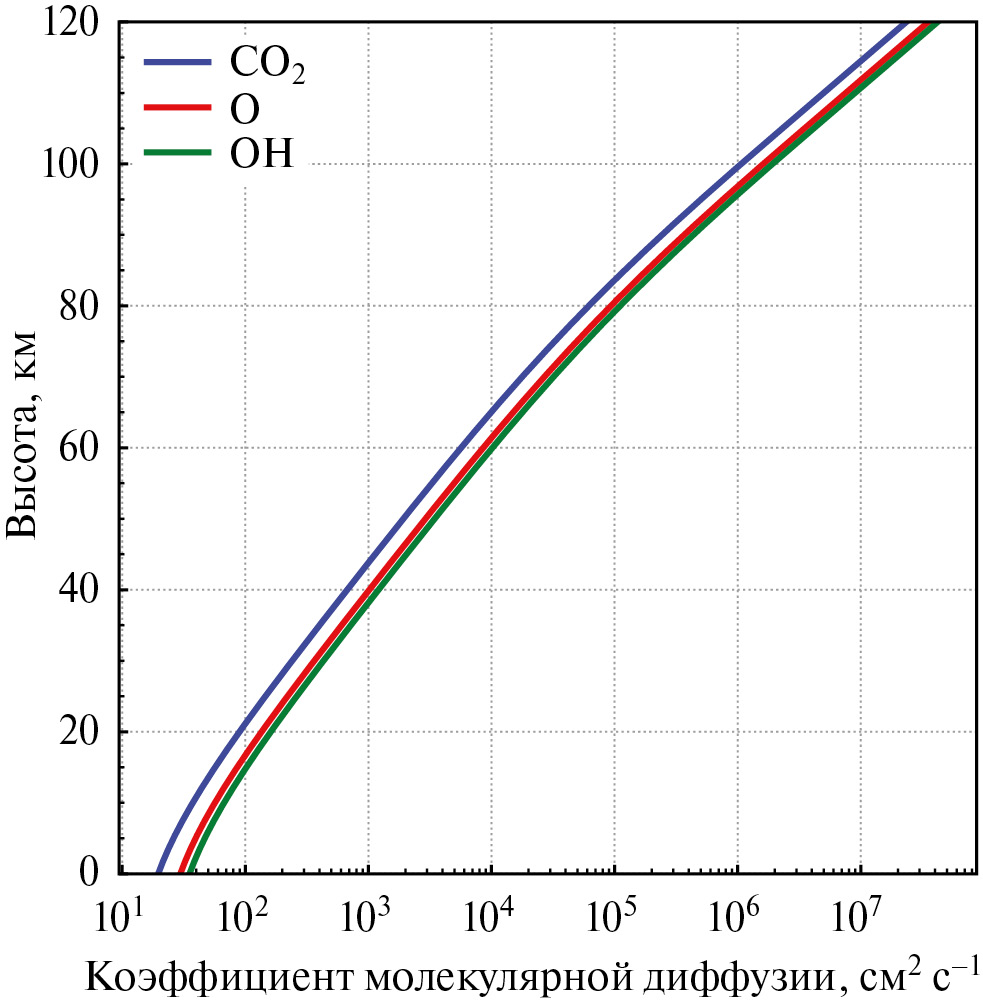 Зависимость коэффициента молекулярной диффузии от температуры и, как следствие, от высоты для каждой компоненты вычисляется по формуле Чепмена–Энскога: